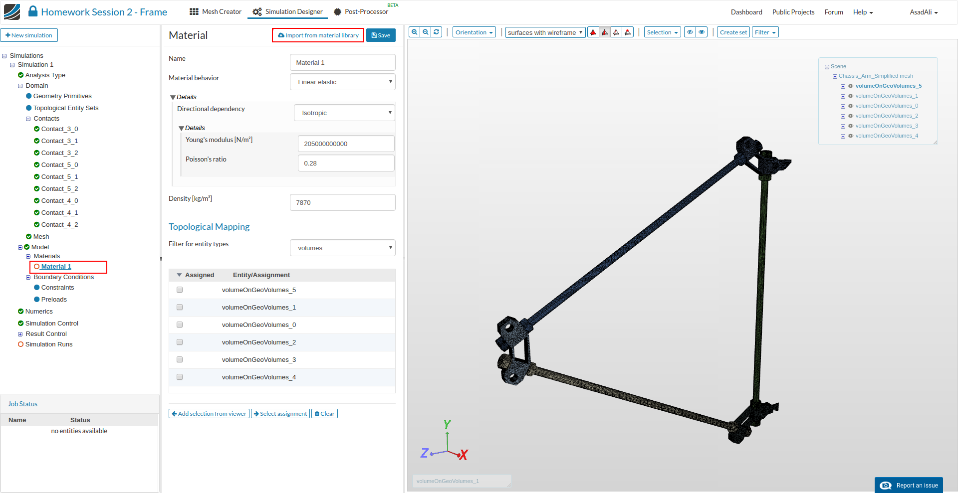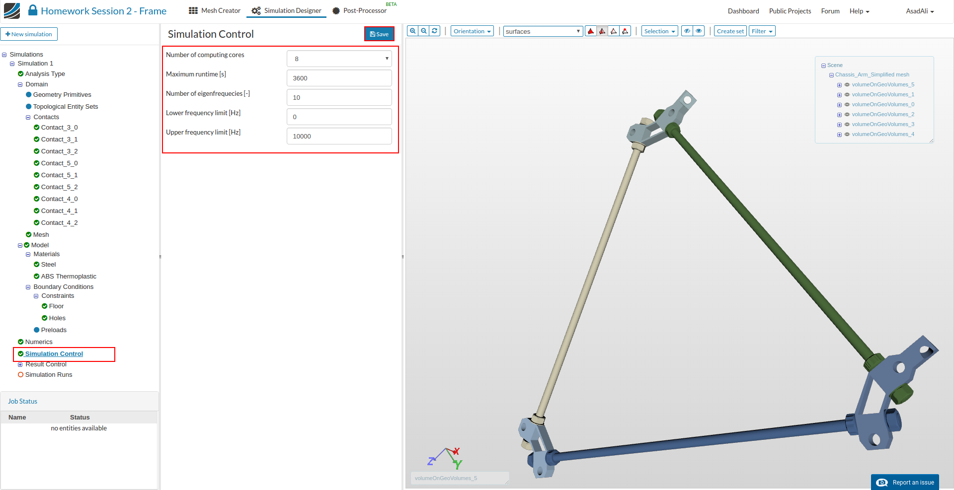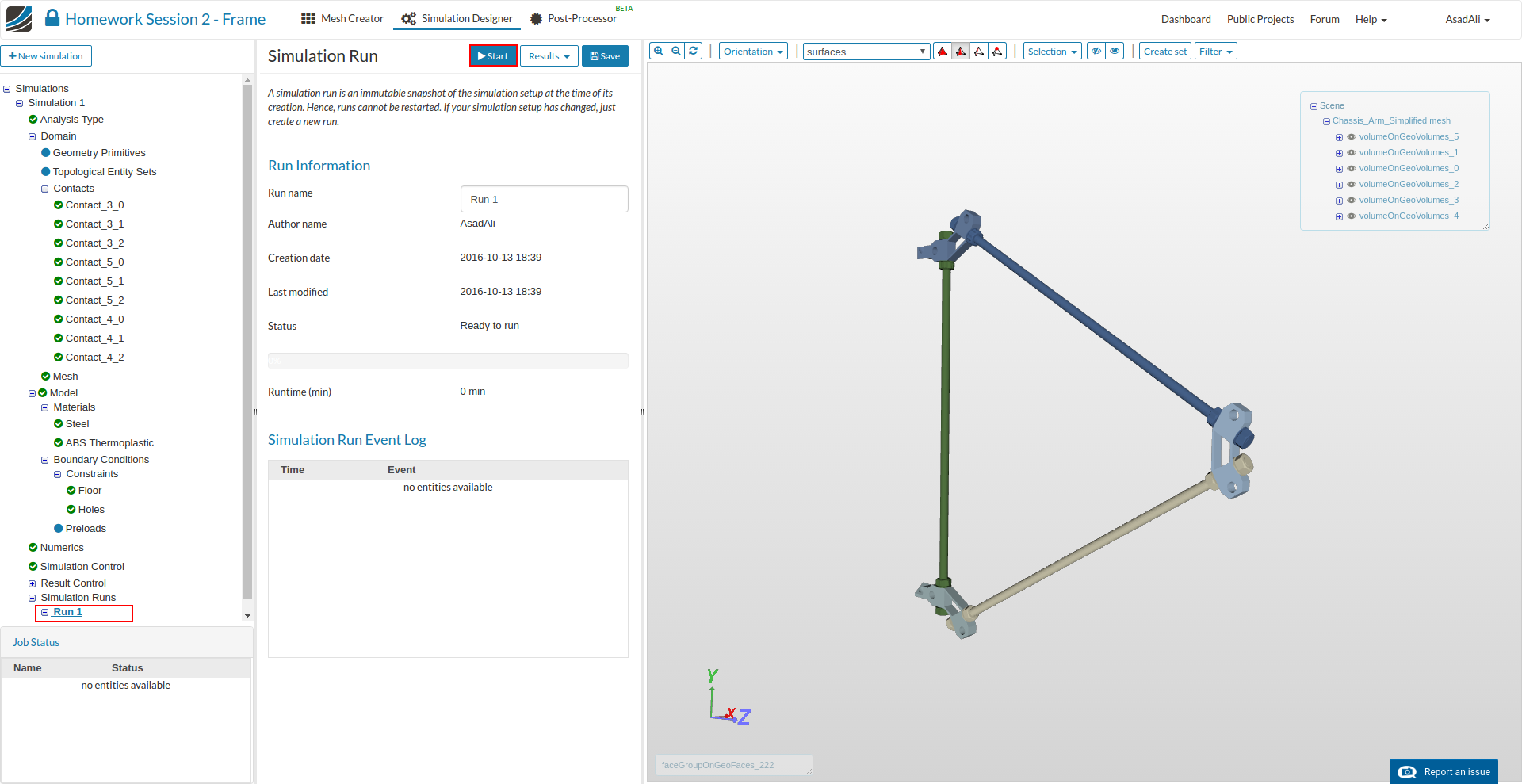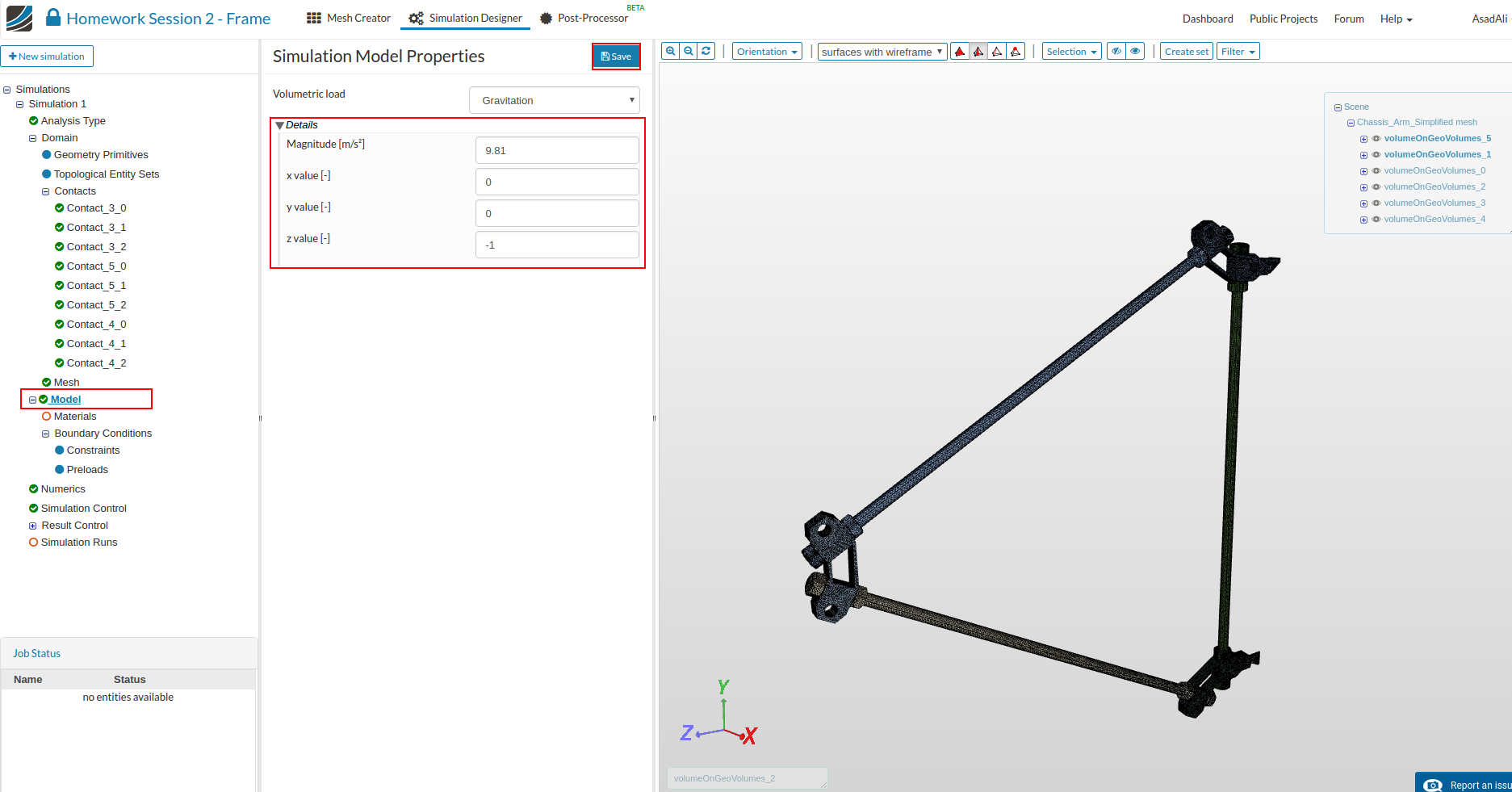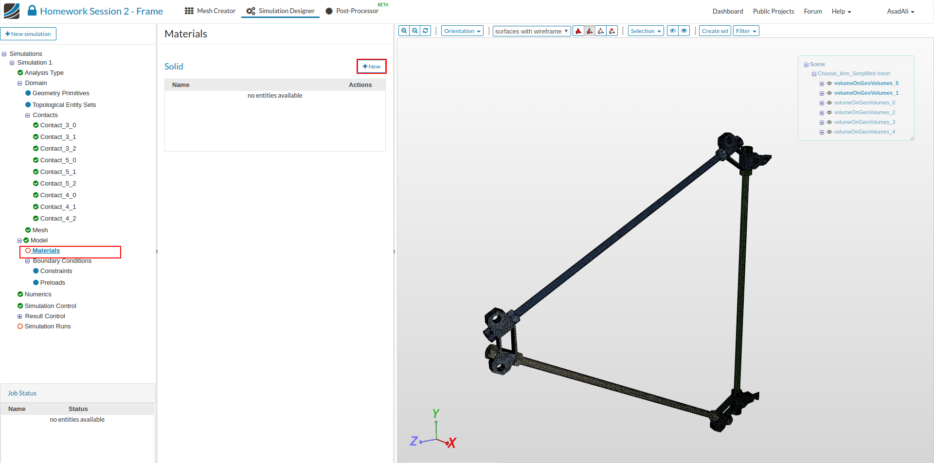 Since we are simulating an assembly of parts it is necessary to define the interactions withing the assembly and with its environment. We will therefore define this so called Contacts, which are also covering the physical interaction between parts. This topic was also covered very detailed during the last webinar. You can find the section about contacts here