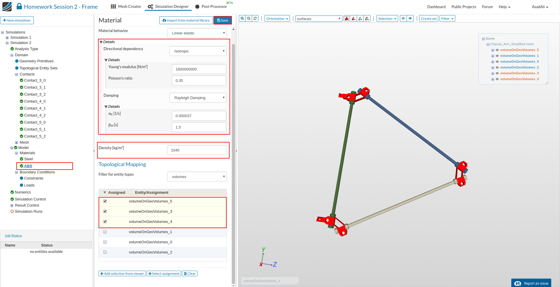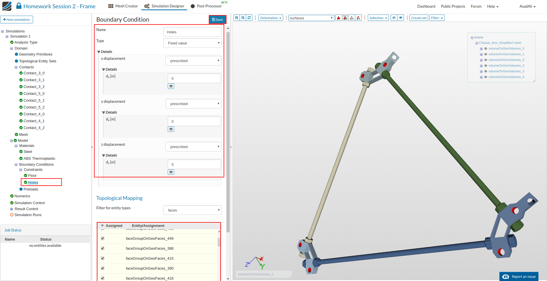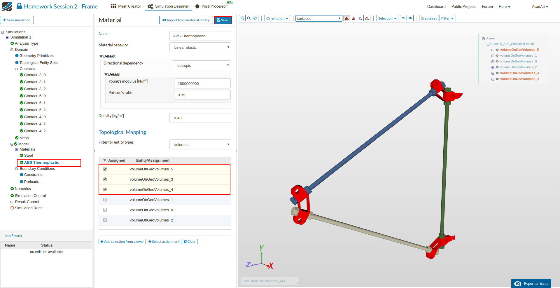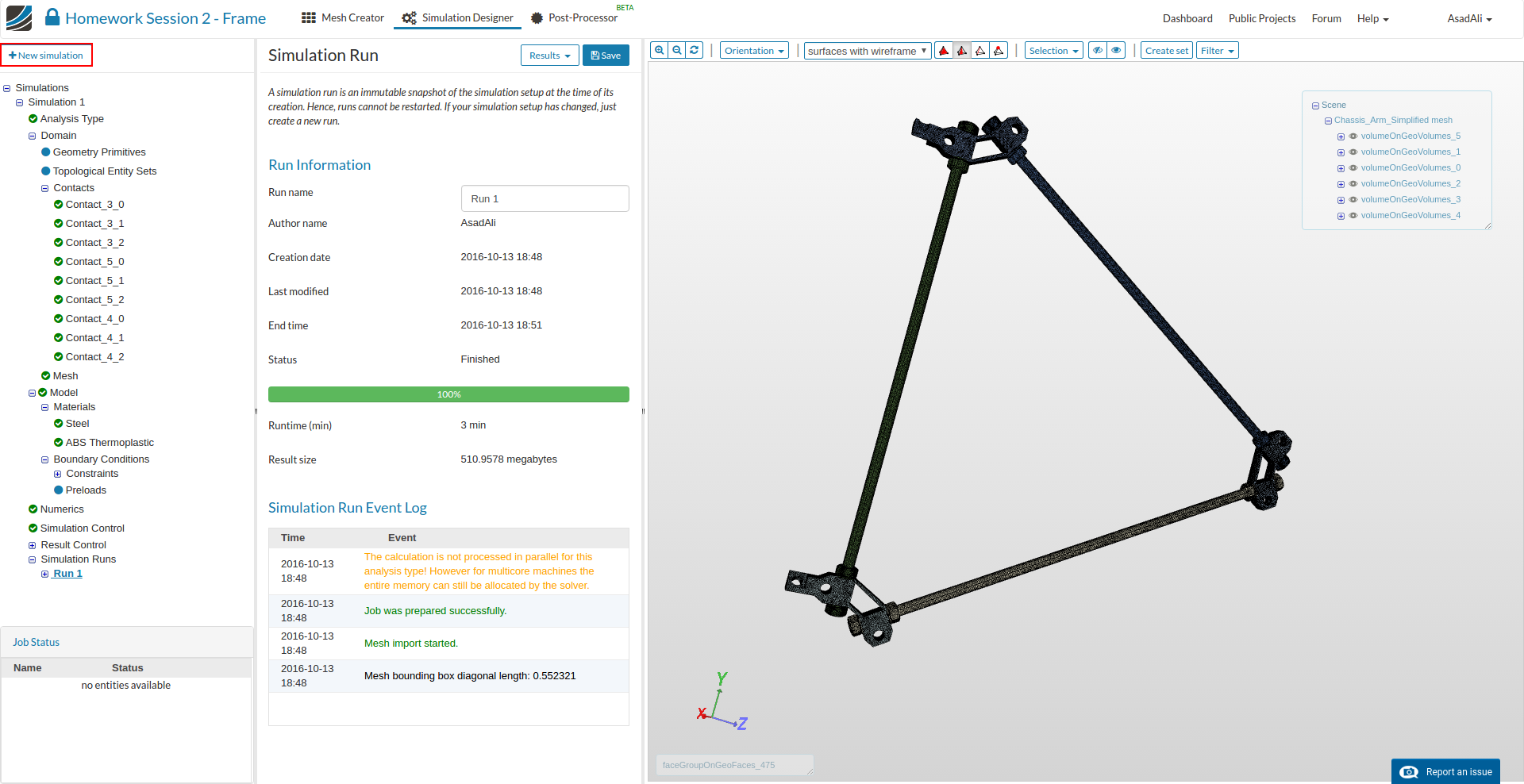 Since we are simulating an assembly of parts it is necessary to define the interactions withing the assembly and with its environment. We will therefore define this so called Contacts, which are also covering the physical interaction between parts. This topic was also covered very detailed during the last webinar. You can find the section about contacts here