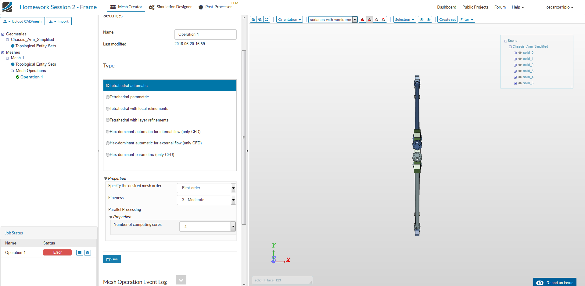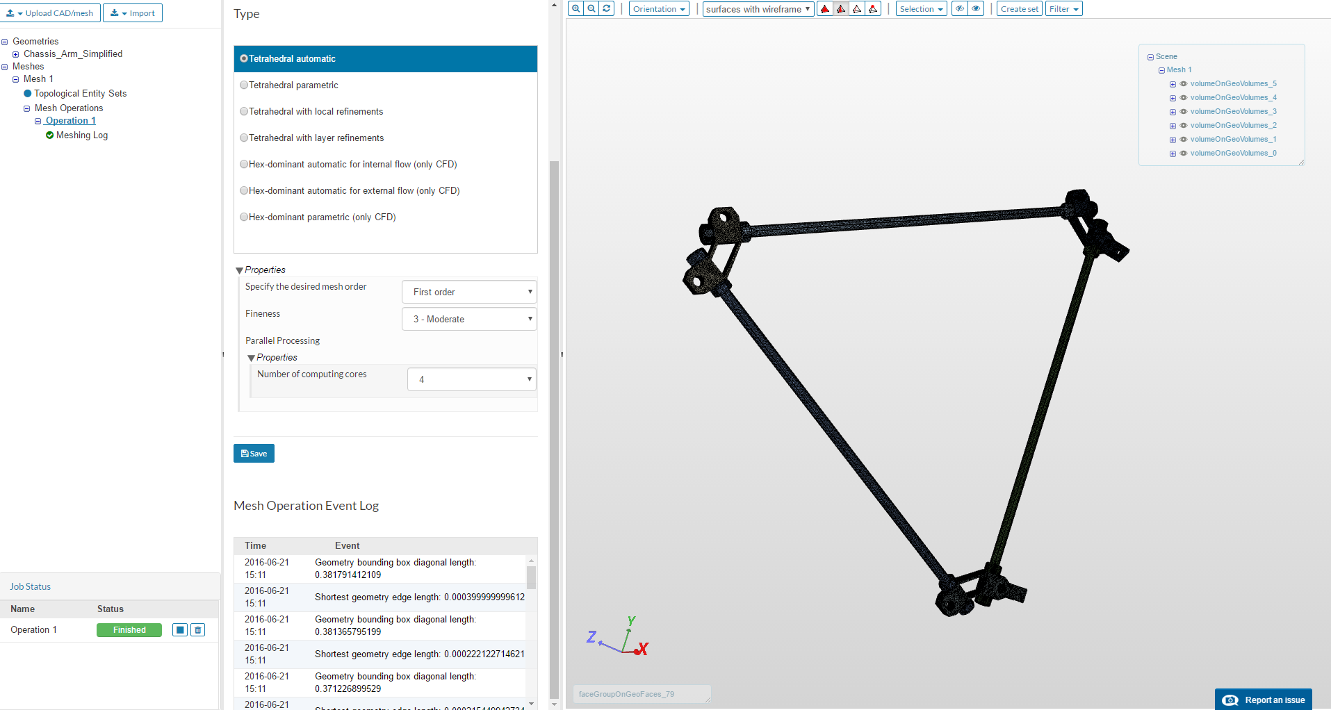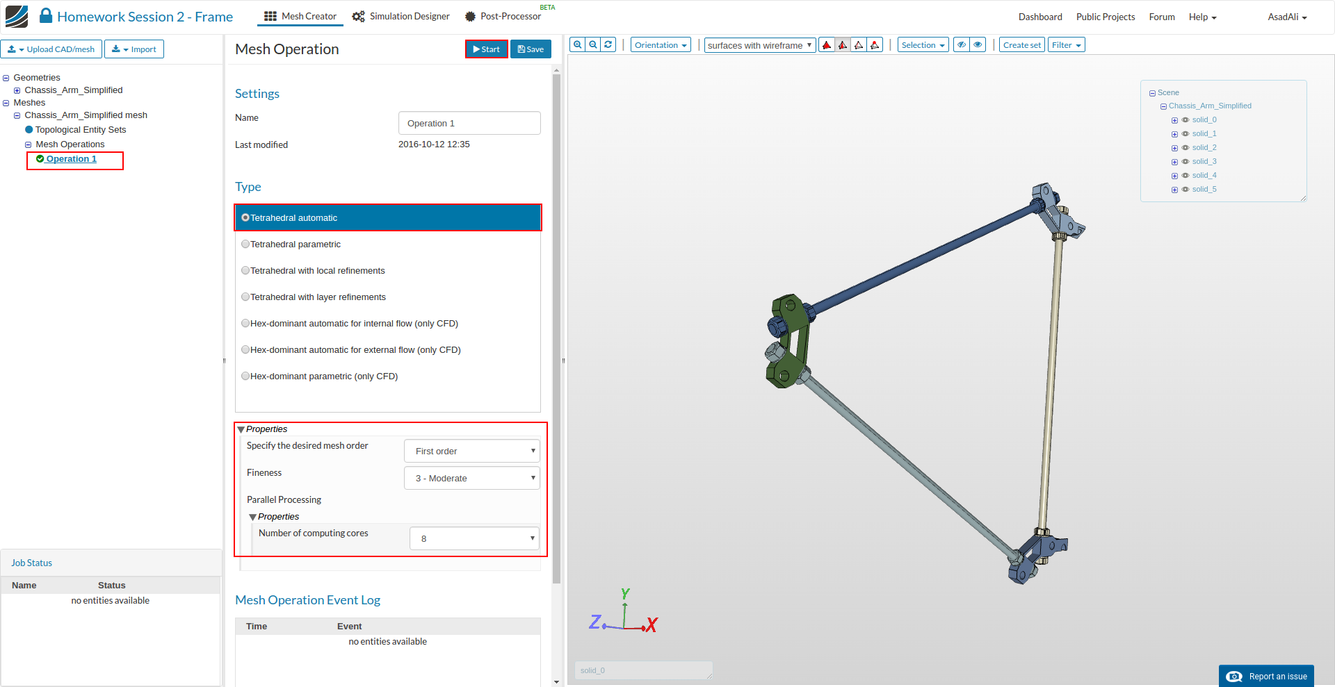 A new mesh tree will be added in the left column and in the middle column you can select the mesh type and other parameters. Select Tetrahedral automatic from the list and choose the following settings