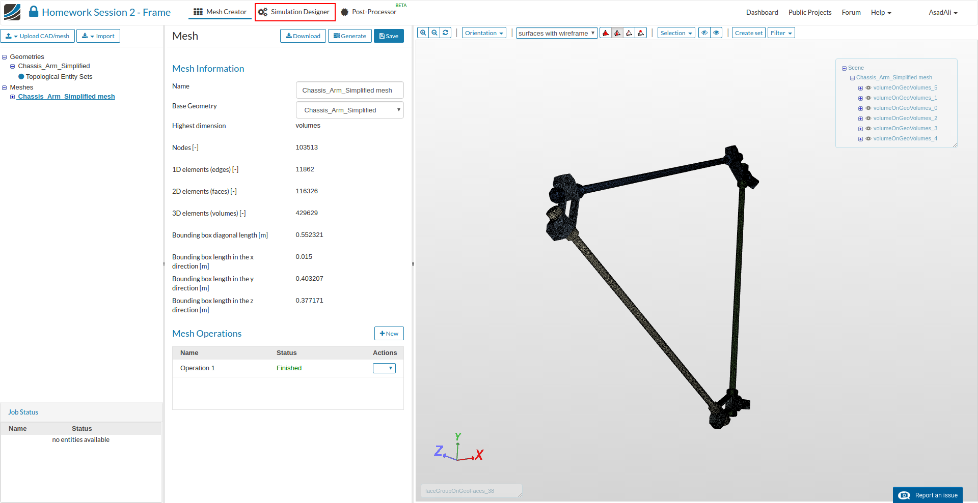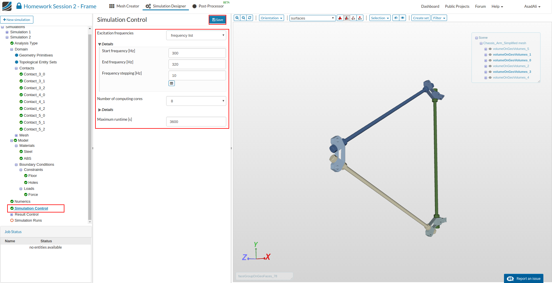 Our aim is to investigate the mechanical behaviour of the frame of the 3D printer. We will therefore run two different simulations. First of all, we have to identify the critical eigenfrequencies of the printer frame. Later on, this information will be used as an input to analyze the physical response of our system.