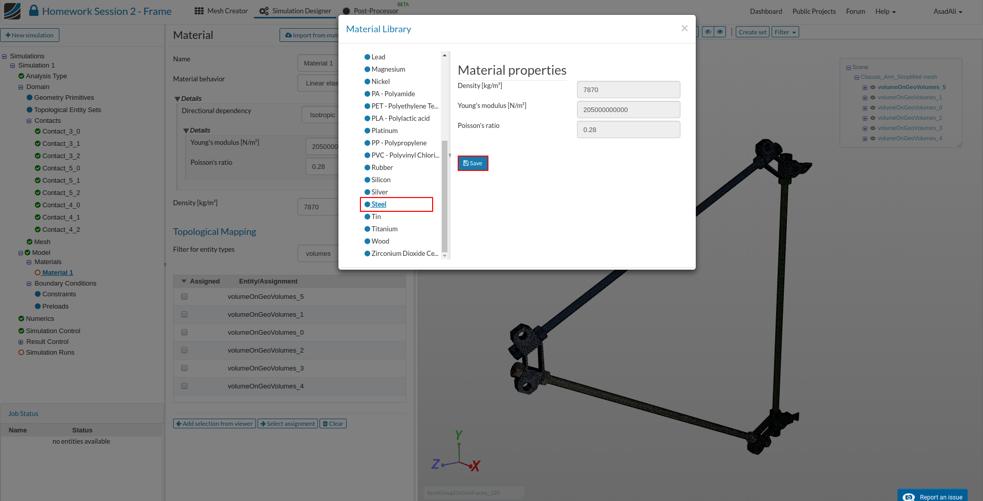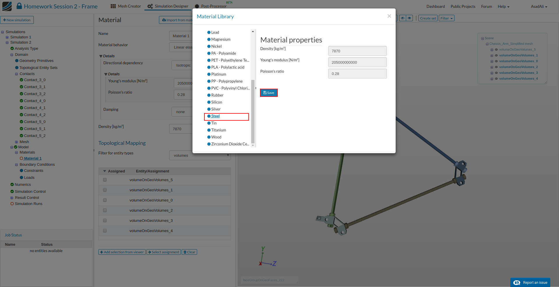 Please select steel from the list on the left side and save your selection by clicking the related button.