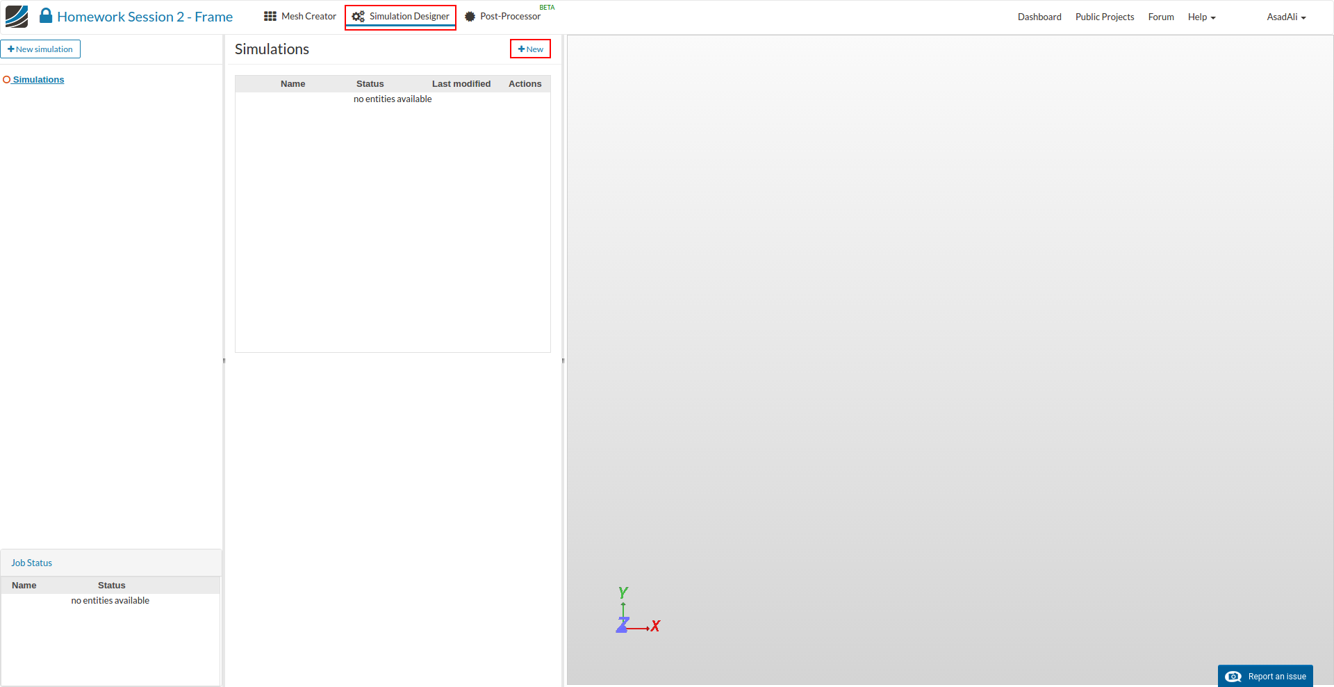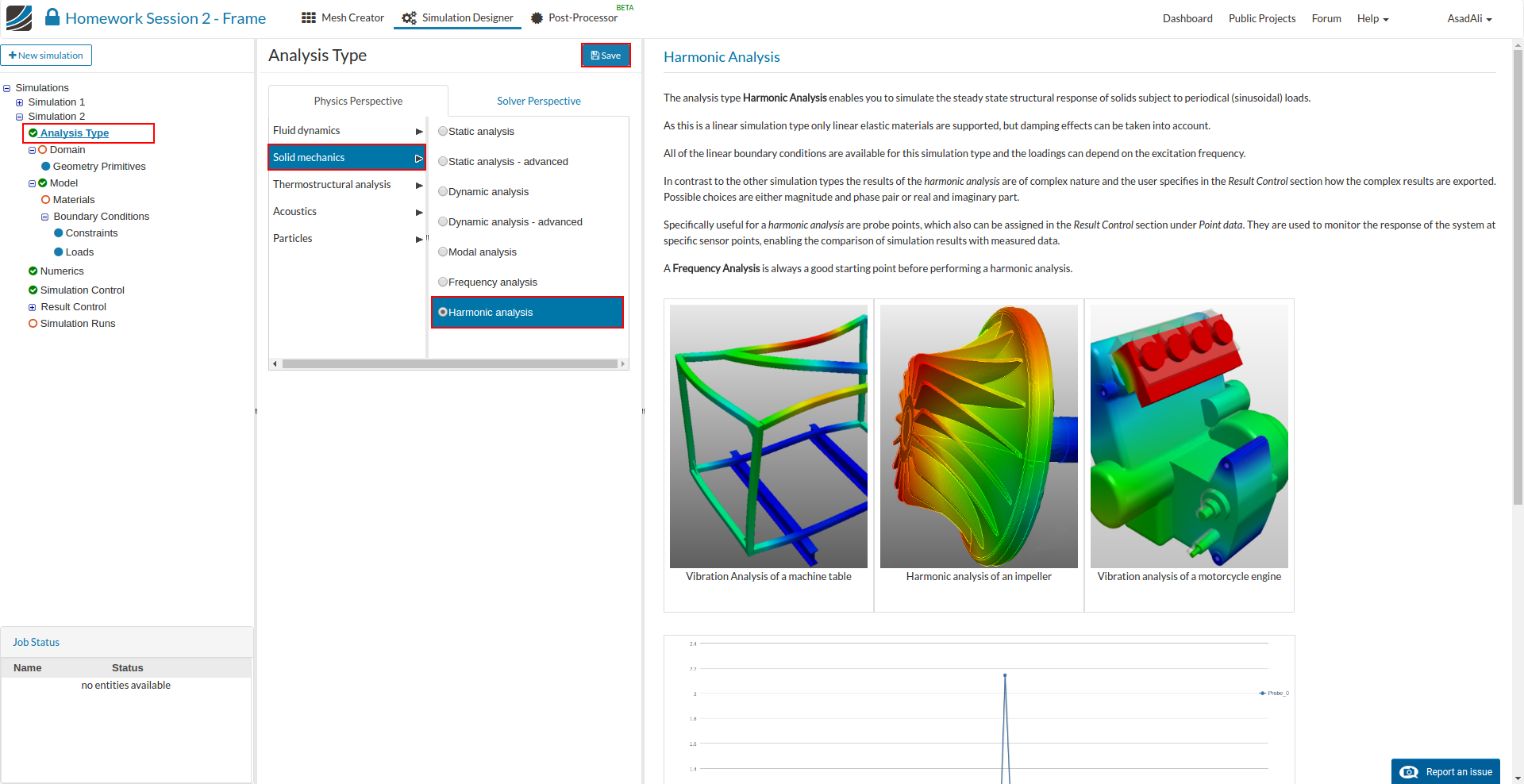 This will open an additional column in the middle. Here you can select which kind of simulation you want to run. In our case we will run a Frequency analysis to receive critical frequencies for the harmonic analysis.