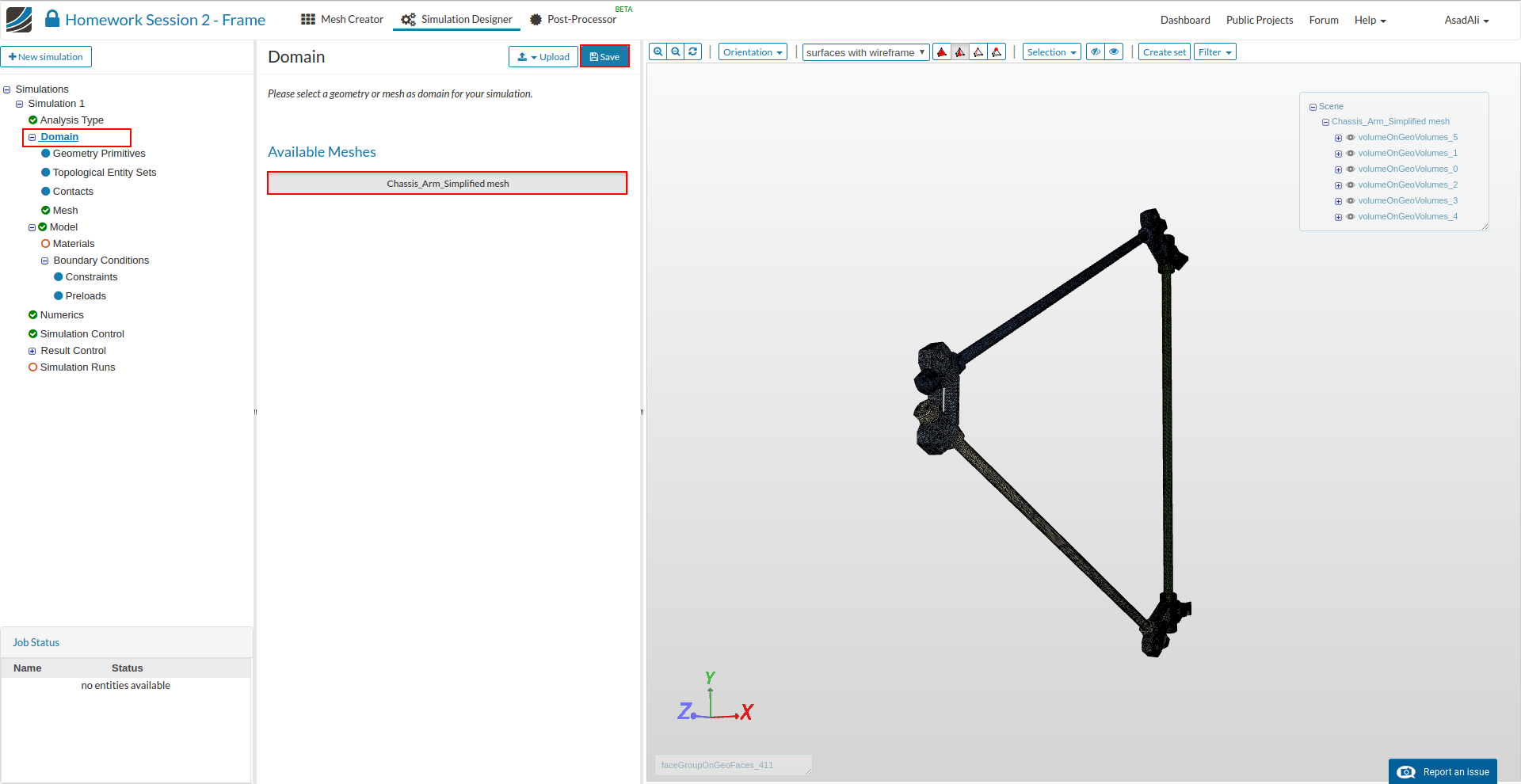 Next you have to specify which mesh you want to use for your simulation. Click on the Domain item in the project tree and select the respective mesh from the menu which appears in the middle column. Don’t forget to save your selection.