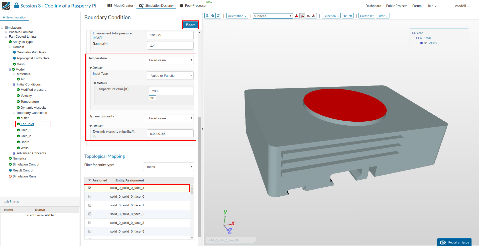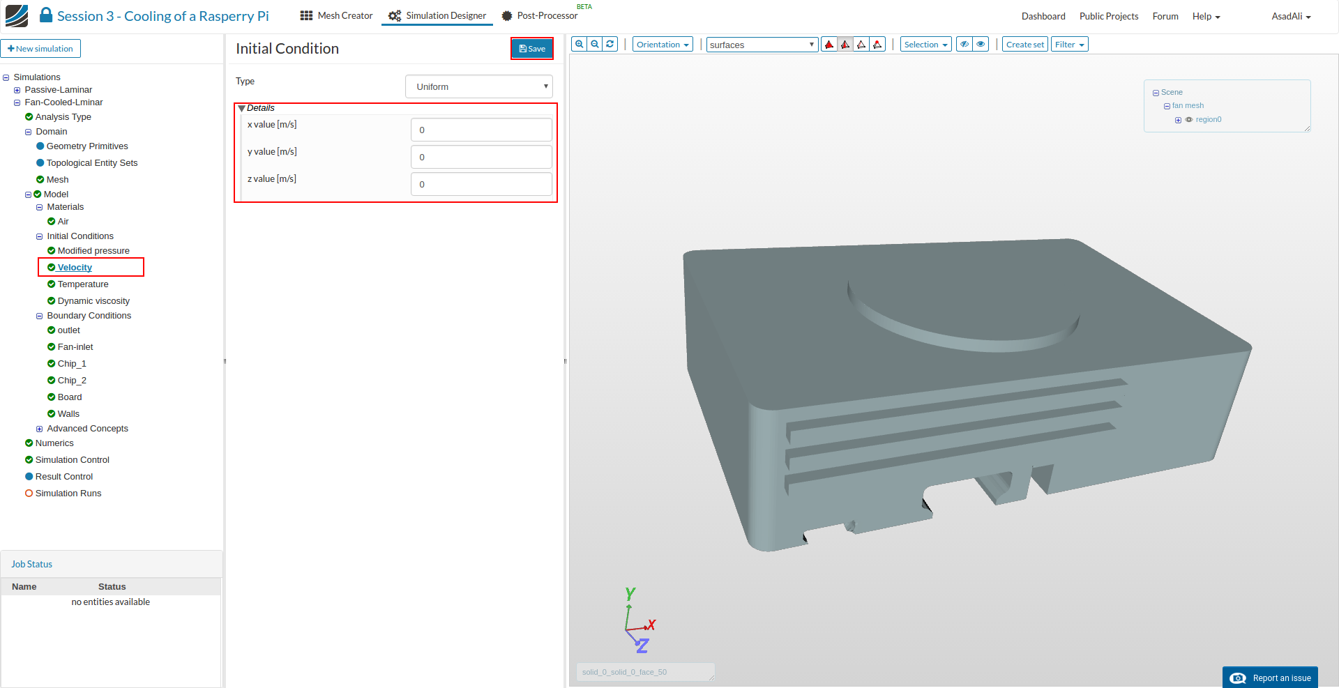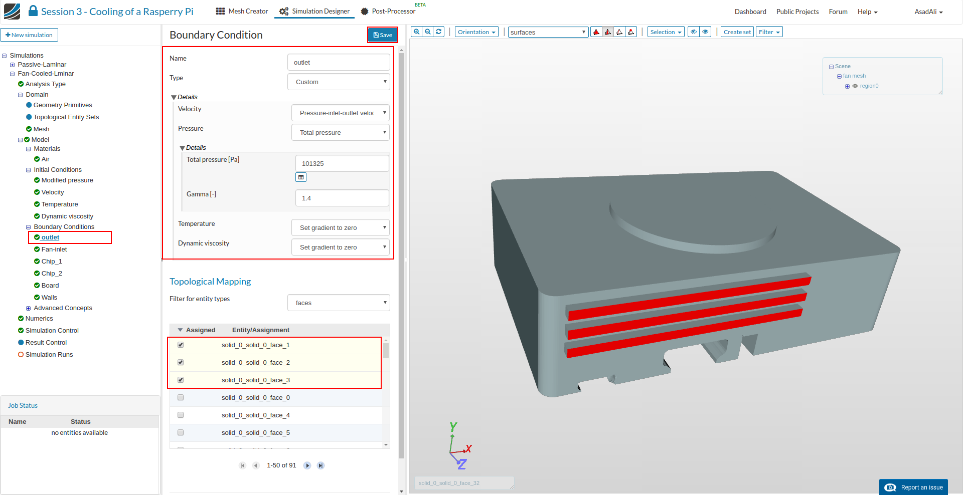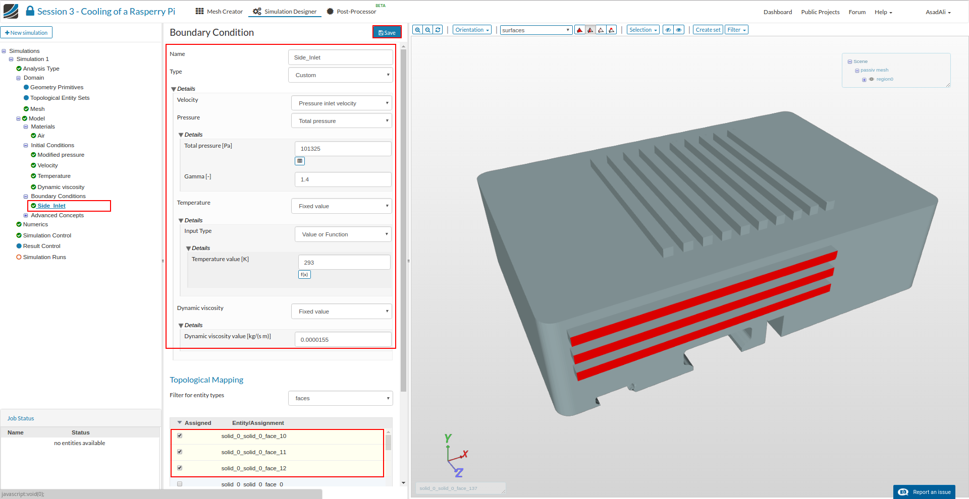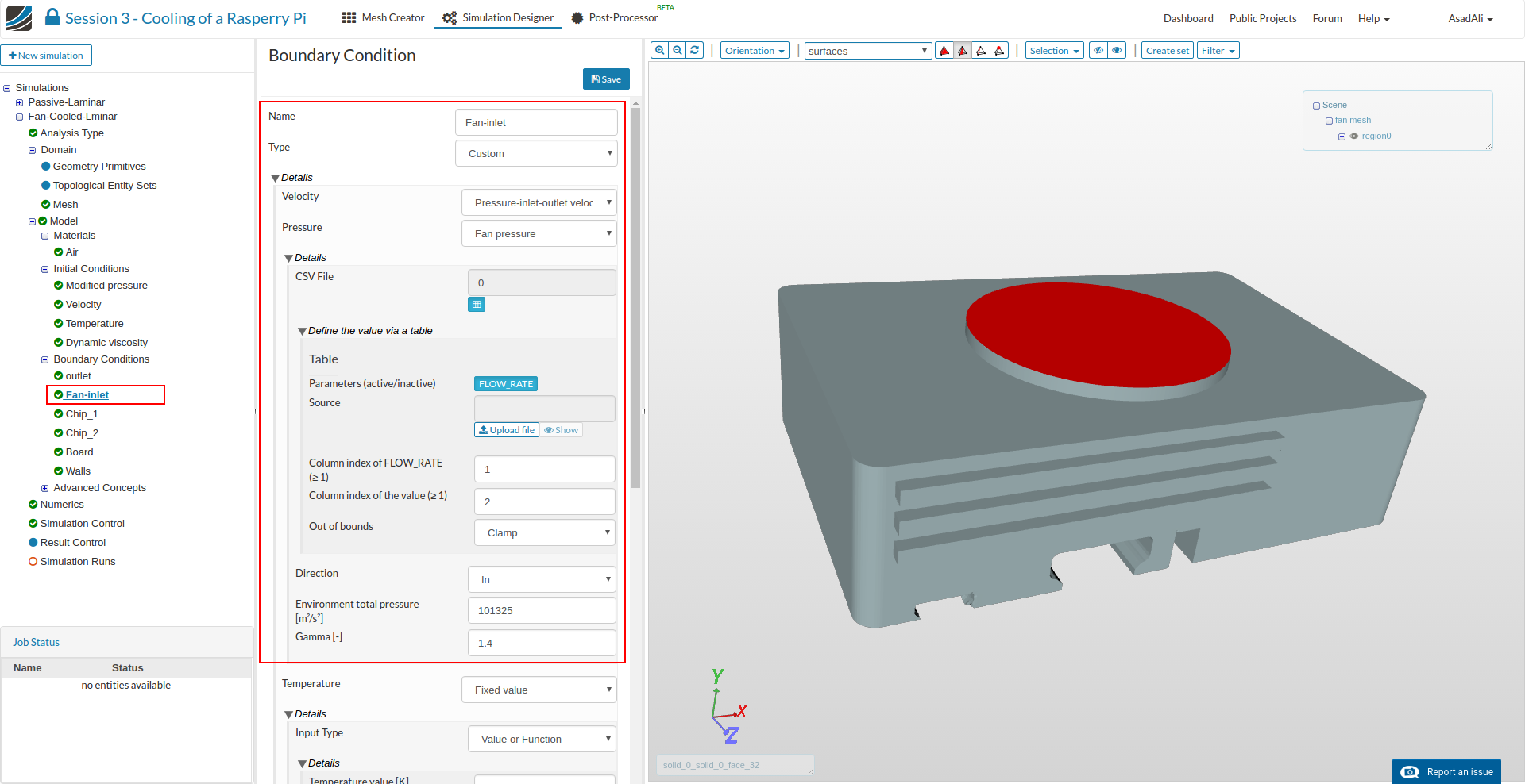 Since this setup is intended to simulate a fan and thus forced convection, it is necessary to change the boundary conditions for the inlet and the outlet.