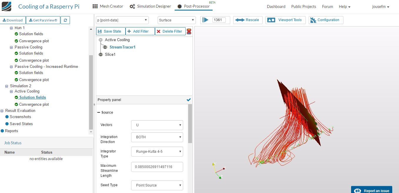 We will now apply an addition filter to create stream lines which show us how the flow is streaming within the fluid domain. First of all you have to select the highest element of the post processing tree (Run 1) before you apply the next filter. Otherwise you would try to apply this filter on the slice.