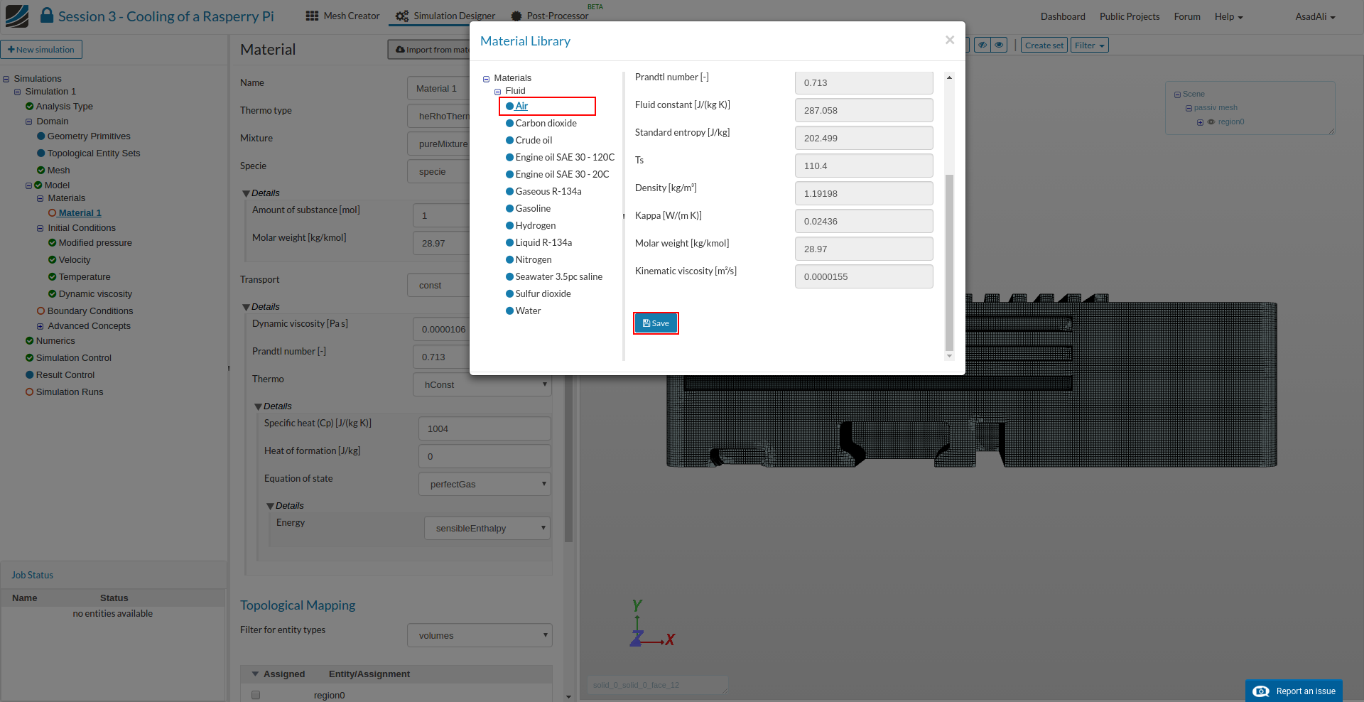 This will open a new middle column windows where you can assign fluids to your mesh. SimScale also comes with a material library which we will use. Click on the Import from material library button. Here choose Air from the list on the left side and save your selection.