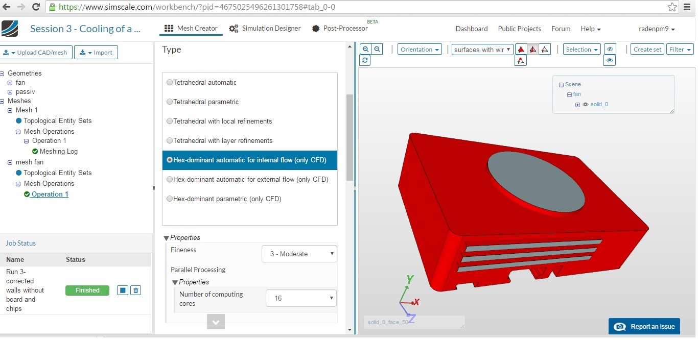 The meshing operation (Hex-dominant automatic for internal flow (CFD)), and the parameters for Fineness and Parallel Processing be maintained.