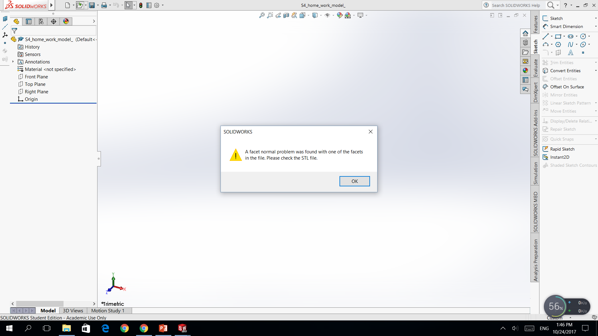 I’m suspecting that this message has to do with the car not showing up after the merge. I can still see the car model in SolidWorks after I click ok on the popup. Same message when opening up the stl file with or without the wing in the assembly.