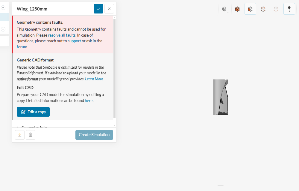 I am trying to import an STEP file into an regular incompressible flow simulation. However, the STEP file generates the message “Geometry contains faults”, something which I have never experienced before when improting STEP files into SimScale. Even more strange, Ansys Fluent seems to take the STEP mesh well so I doubt it is an file issue.