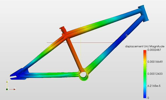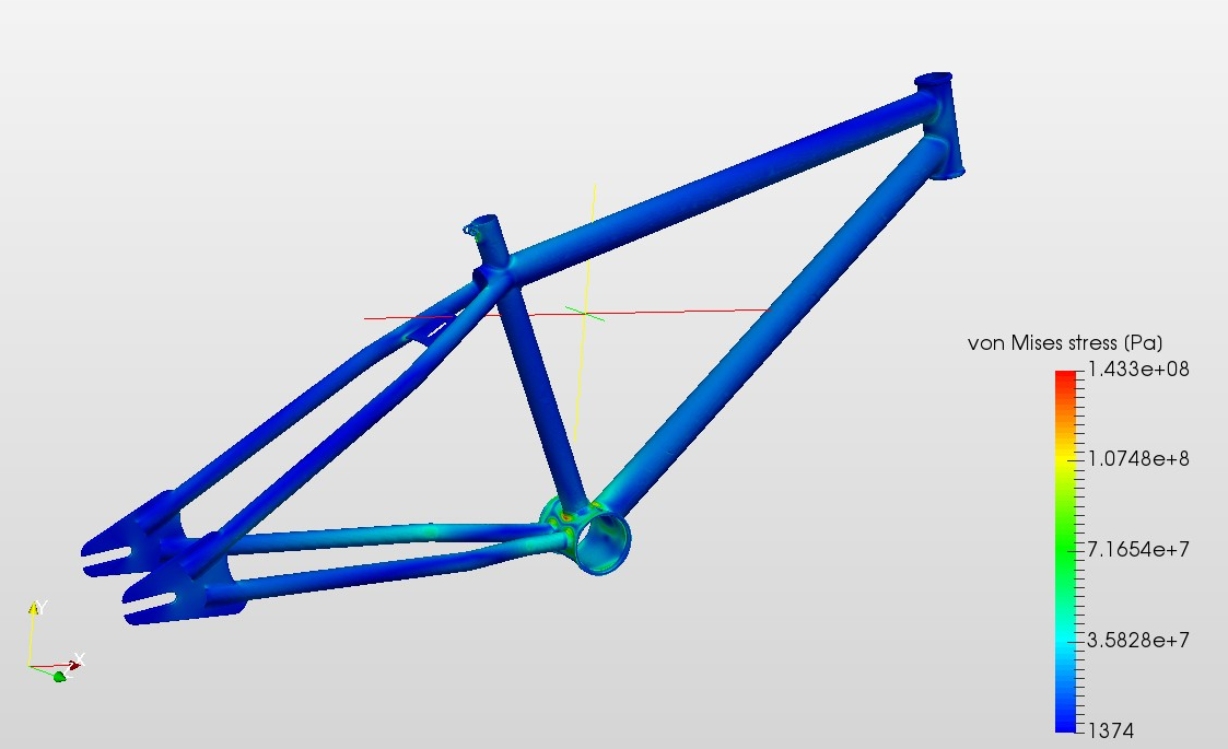 The results (von-misses stress and displacement) for the case ‘Sitting person and driving bicycle on irregular road’ can be seen in the following pictures.