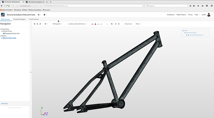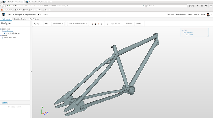 The Geometry of the bicycle frame was provided by GrabCad member unix-89. The model is a single solid and uploaded to the platform as IGS file. The Geometry of the bicycle frame is shown in the figure.