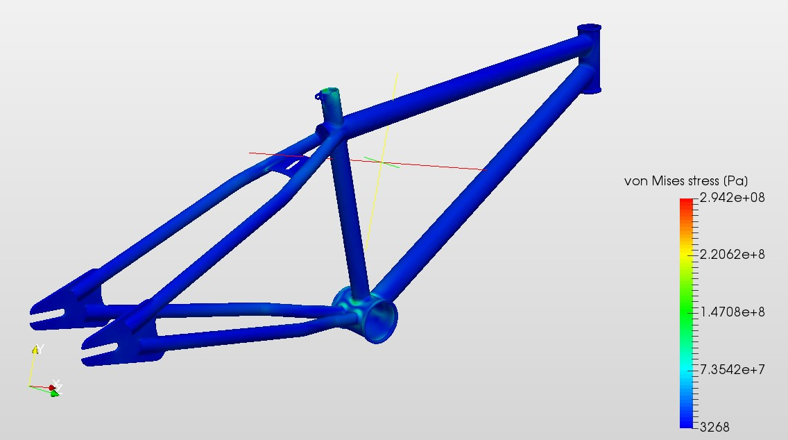 The Geometry of the bicycle frame was meshed using Tet-Dominant mesh operation. The model is meshed with fully automatic second order tetrahedralization and consists of 1075757 nodes. The generated meshes are shown in the figure.