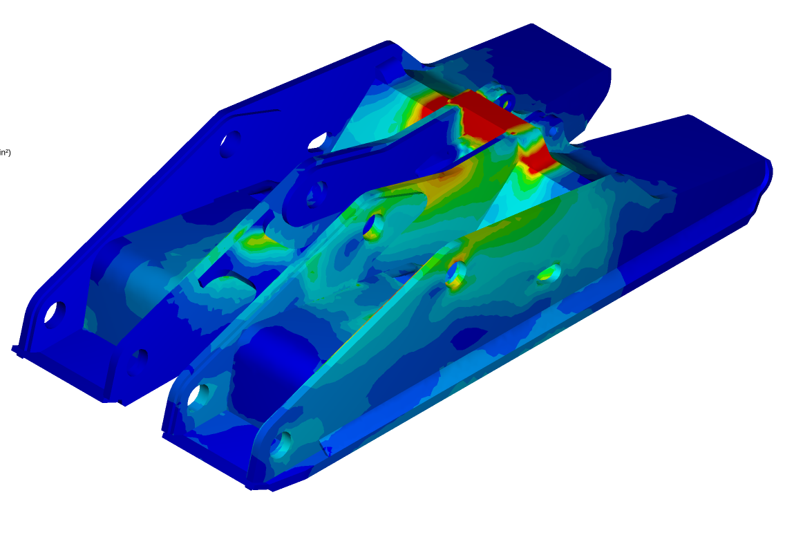 This project is a static simulation of part of a roof support machine for underground mining. The part is the base of a machine like a giant heavy-duty scissor jack. I am trying to see of the large plates that tie the two halves of this base together are adequate. These two ‘bridge’ plates are colored orange and purple in the model.