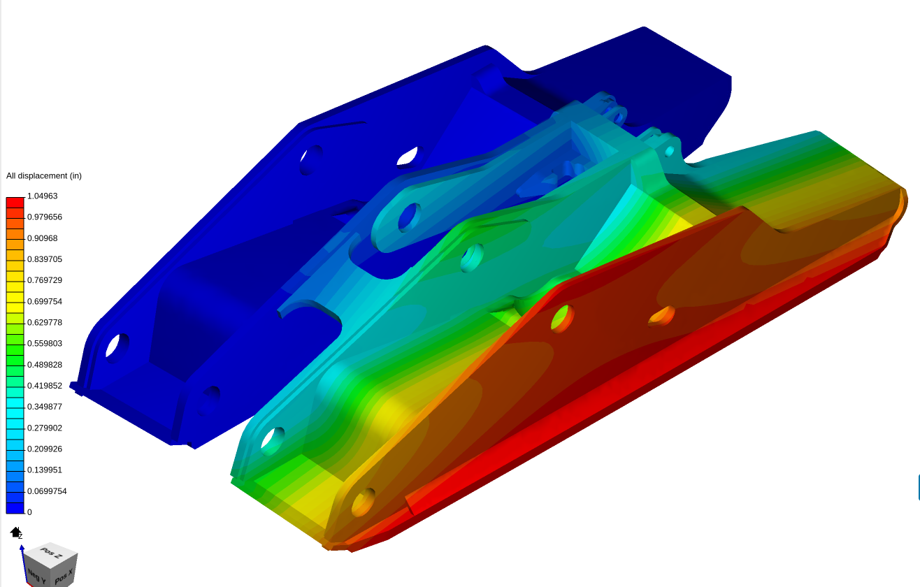 Over the weekend I was able to get some simulations to finish. If you look at the project I have made a bunch of attempts to make it work and get some reasonable results. One thing that keeps happening is a result that I know just cannot be true. If you go to the simulation solution field below and look at total deflection…there is an orange area right next to a yellow area. These two plates are welded together, and in fact I have combined them into one item in my CAD package. So they should move together as one. Also in general the deflections seem to be really small when compared to what I actually see in real parts.