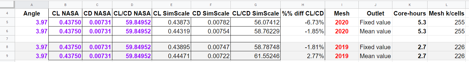 You can see that mesh 2020, with Fixed value Outlet gives CL/CD -6.73% compared to NASA experiment. Mesh 2019 was 1.81% off.