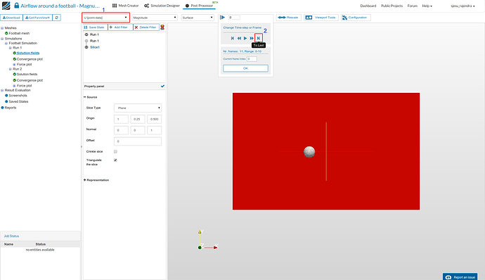 - Move the solution to the last time step (1000) as shown in the image below (refer number 2). Any intermediate time steps can also be obtained by playing around with this field!