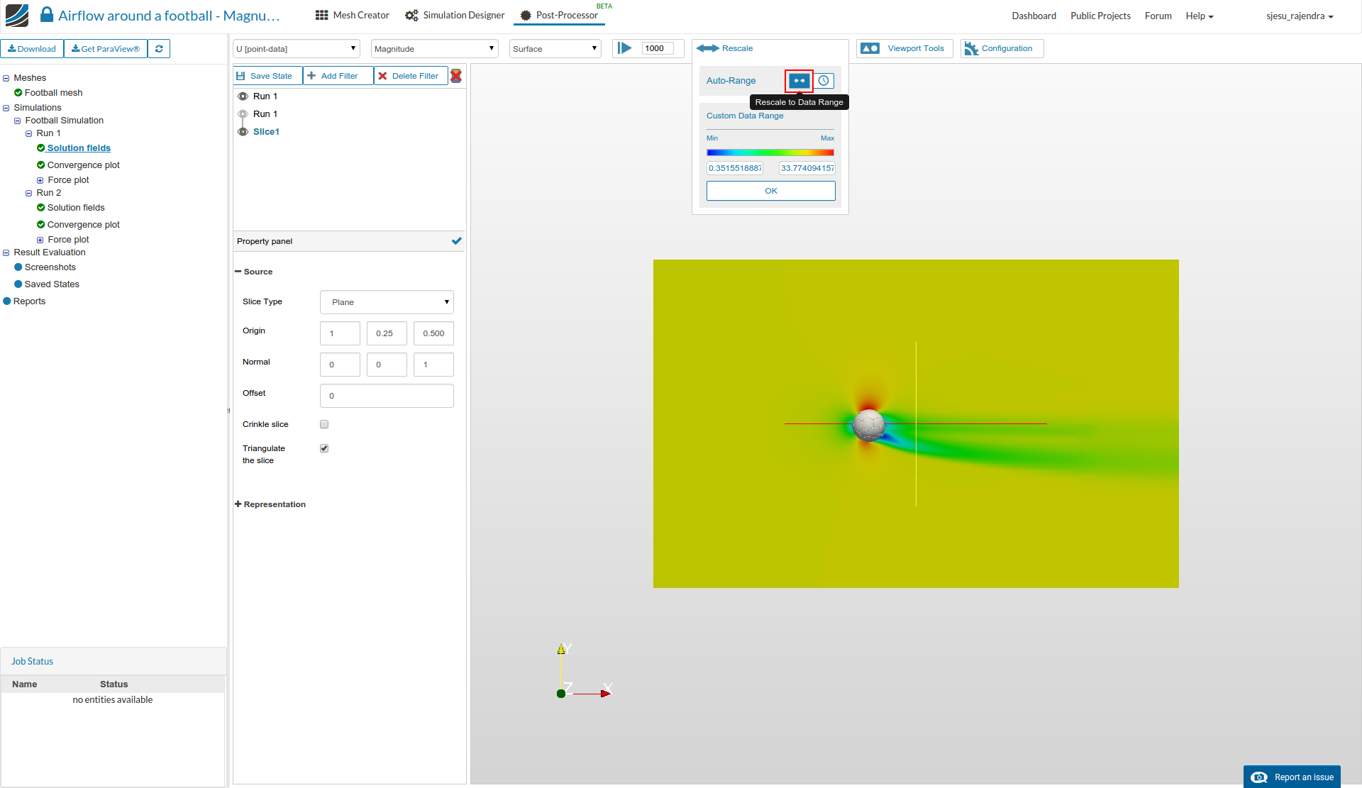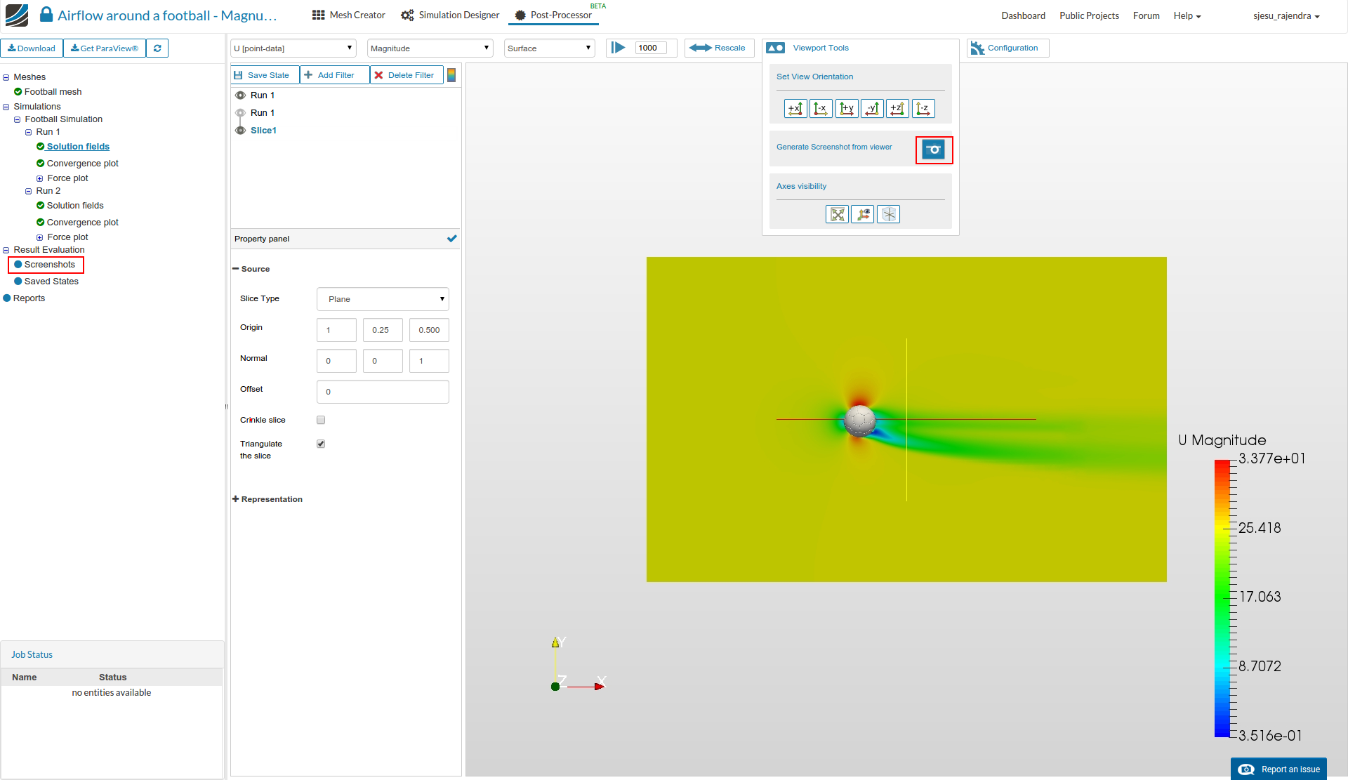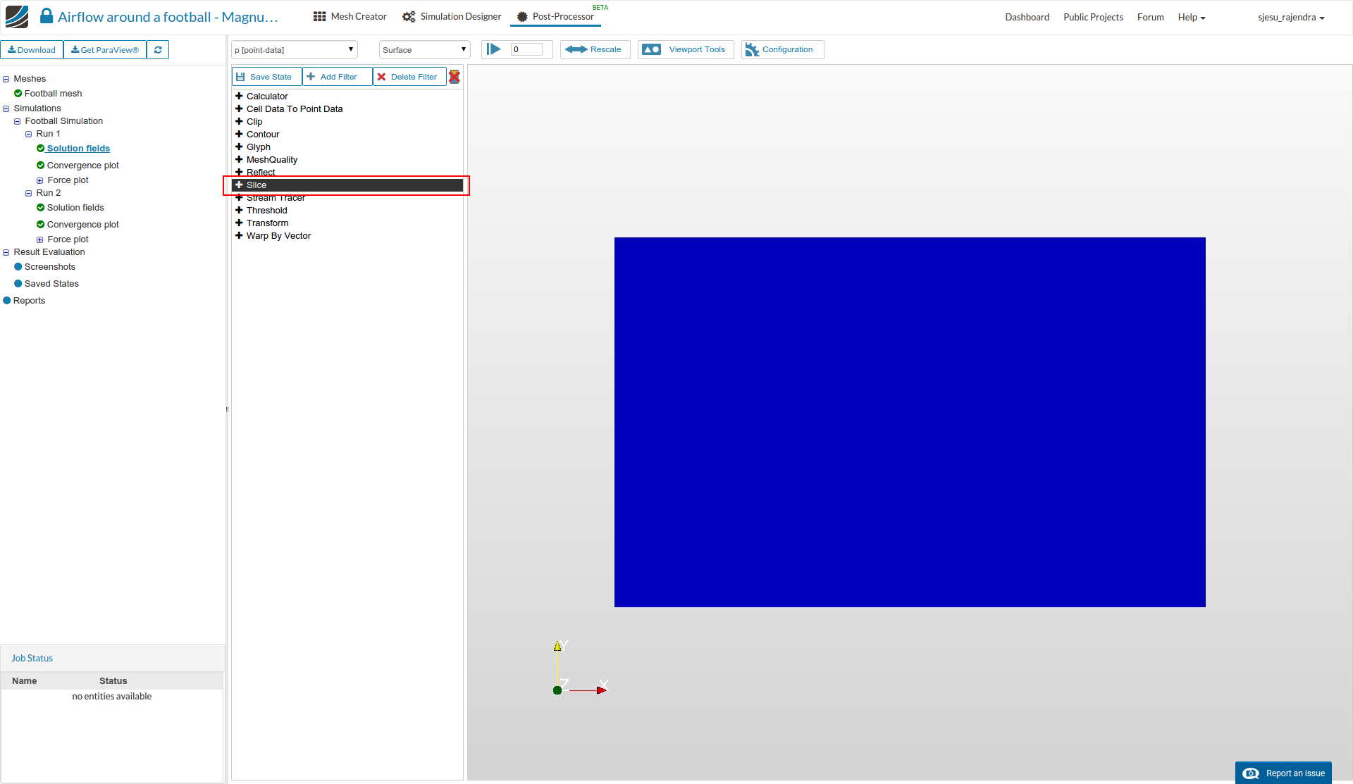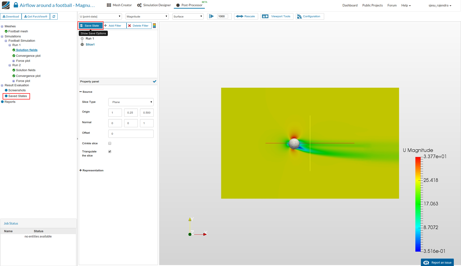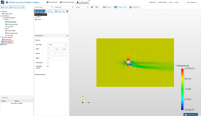 - In case we would like to view the result at a later time it is possible to save this state and click this to view the results directly (the slice of the internal mesh with the football region). This can be done as shown below.