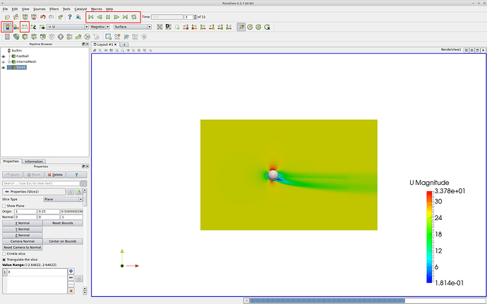 - The play button is clicked in the time step control to allow Paraview to view the solution along timesteps.