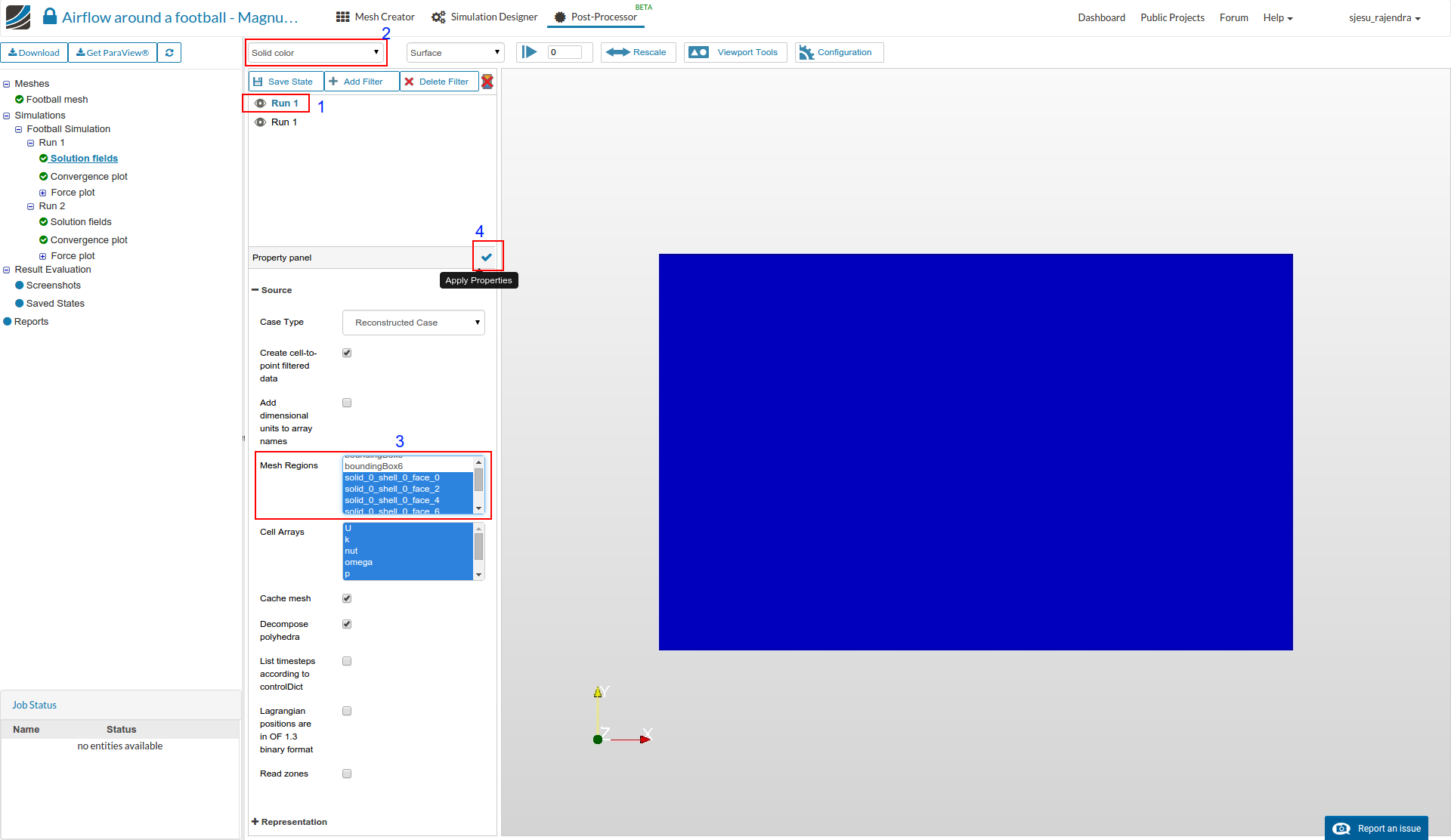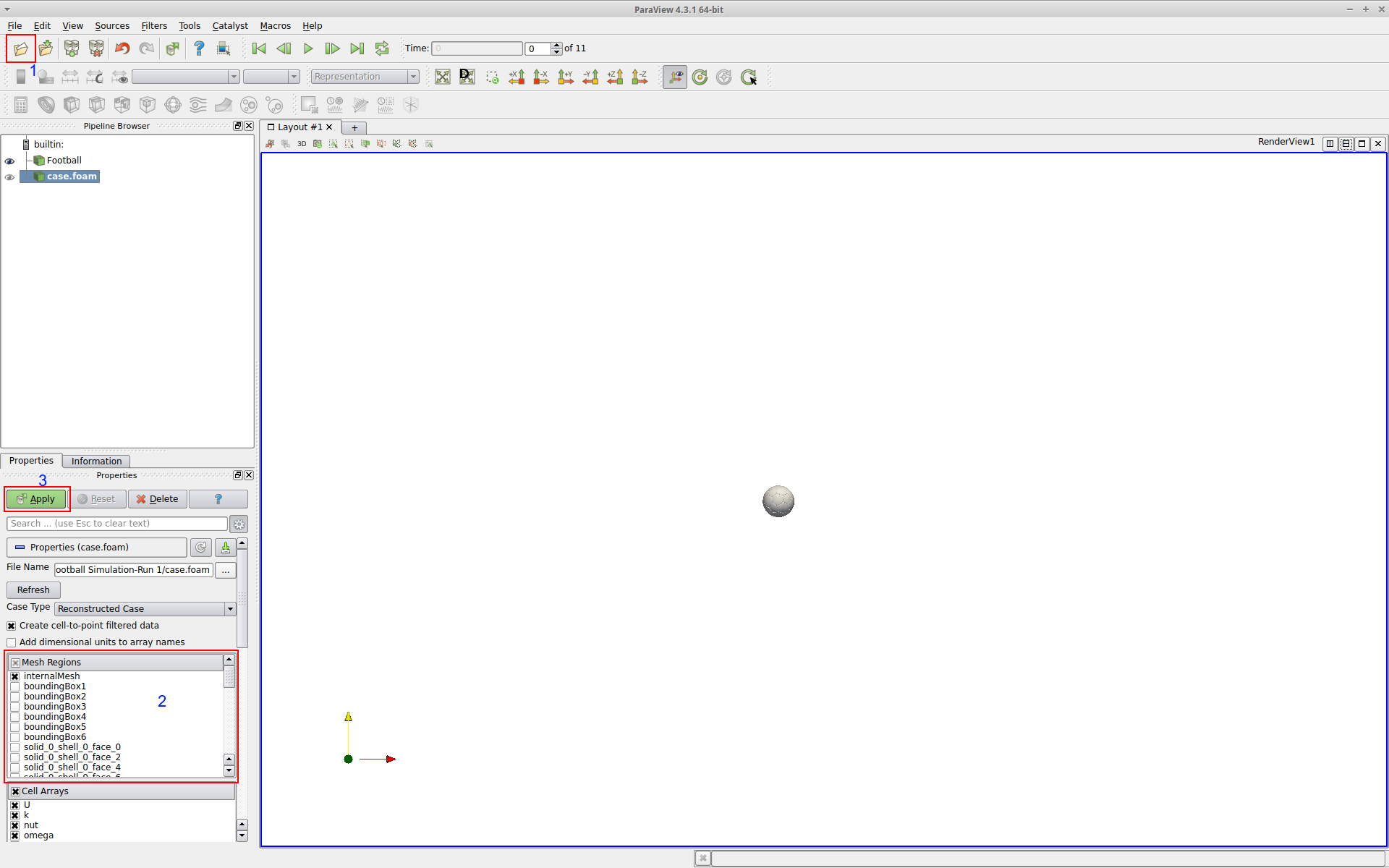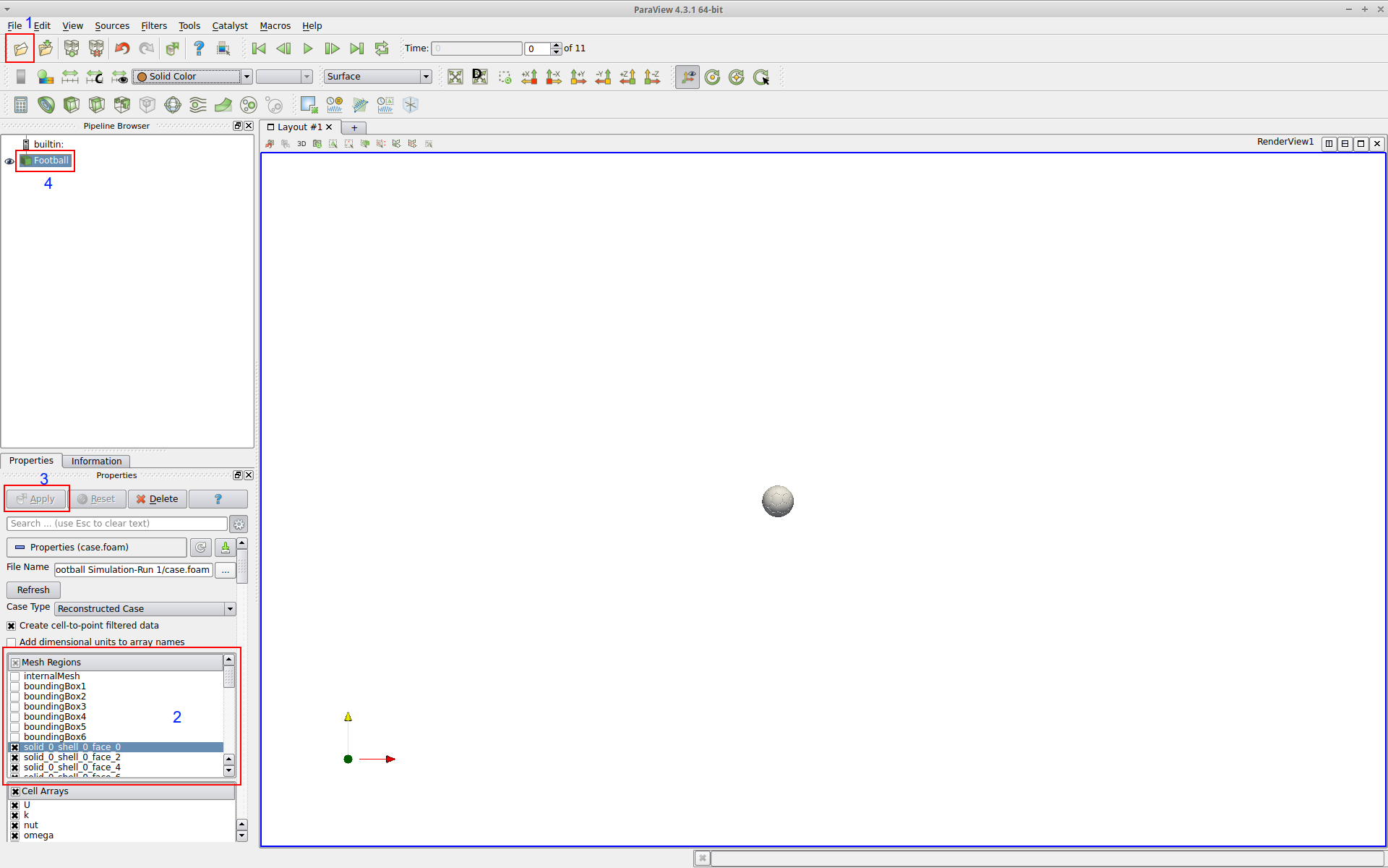 - In Paraview, click on File - Open (also by clicking the icon as shown below (refer number 1)) and select the file case.foam from the result folder. Please note that this can be done any number of times to load the solution data into the Paraview window (analogous to adding result to the viewer in the integrated post processor of SimScale).