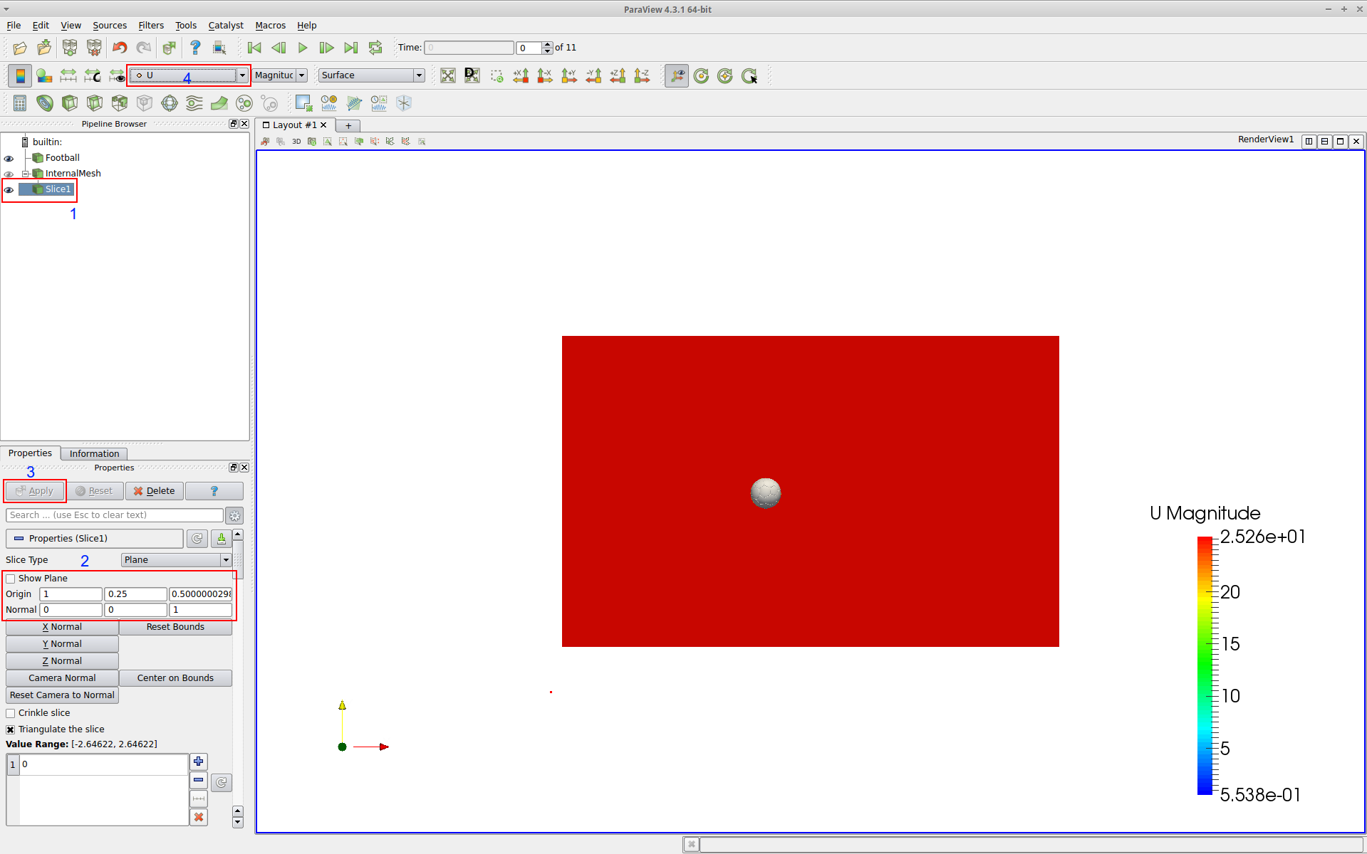 - Select the slice and then change the type to velocity data U [point-data] (refer number 1).