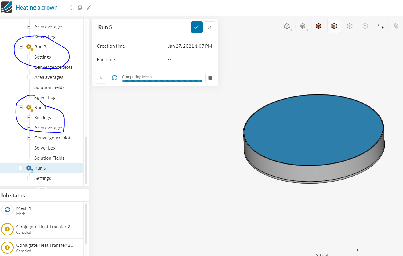 This is the error message that indicates the cause of the cancelation: “The specified maximum runtime of the job was exceeded. The simulation run was stopped and potential intermediate results were restored. You can try to increase the maximum runtime in the simulation control section and start a new run to enable a complete simulation run.”
