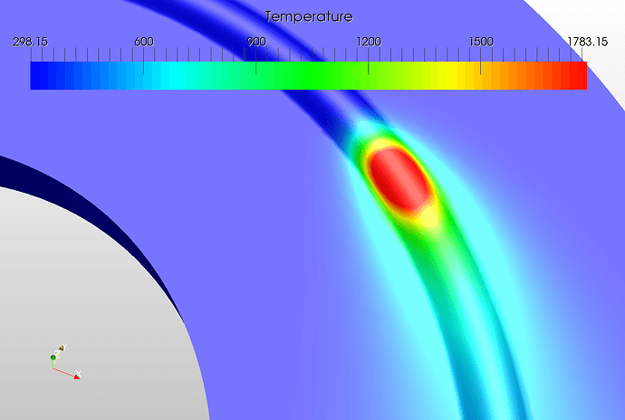Although the temperature of the laser beam was much higher than the highest temperature of the legend i.e. around 2500 K, the trimmed value of 1783.15 K is used since it represents the melting temperature of steel.