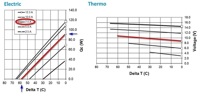 We’ll run them at 8$V$, since that’s more efficient than the maximum rated 12$V$ (thus less waste heat to be transported by the second stage). From the plots in the manufacturer’s datasheet, that draws ~7.5$A$ (and Qe = 8$V$ x 7.5$A$ = 60$W$), has a maximum Qc of 93W, and \Delta T_{max} of 58C. The device surface area is 0.00175 m^2, and thickness is 0.003 m.