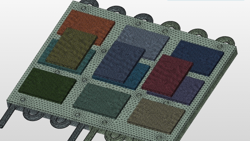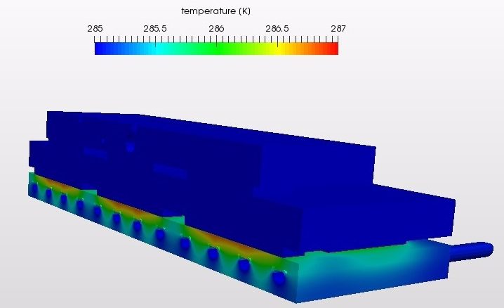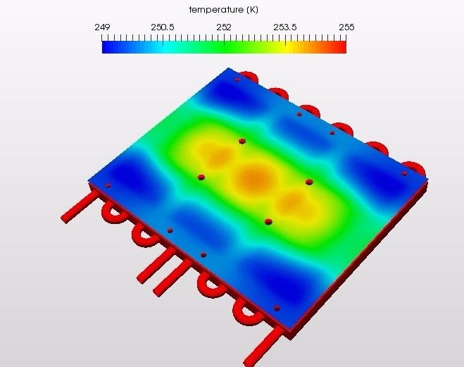Dual stage thermoelectric (peltier) temperature control plate. Objective is -40°C plate temperature with 12°C chiller water. The simulations are testing the effects of different plate designs, materials and thicknesses, temperature sensor placement, as well as estimating \Delta T_{max}.