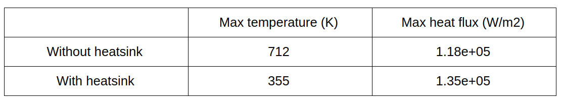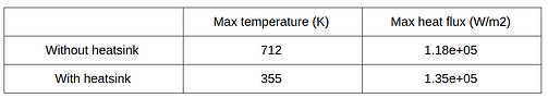 From the simulation results, we can see that the enclosure design without heatsink reaches a very high temperature value of ~712 K, thereby overheating the silicon chips and failing to transport heat effectively from its surfaces. In the other case, the heatsinks do not allow the chips to heat up to high temperatures. The heat spreads across the fins and to the aluminium enclosure thereby benefiting itself from a natural convection process. The maximum values of the temperature and heat flux are shown in the table below.