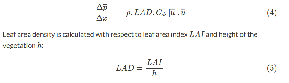 - When measuring the drag in e.g. a windtunnel: Cd is depending on wind velocity and on the leaf coverage (LAI) of the tree [Koizuma, 2010, Fig. 5: https://www.researchgate.net/publication/44385014_Evaluation_of_drag_coefficients_of_poplar-tree_crowns_by_a_field_test_method ].