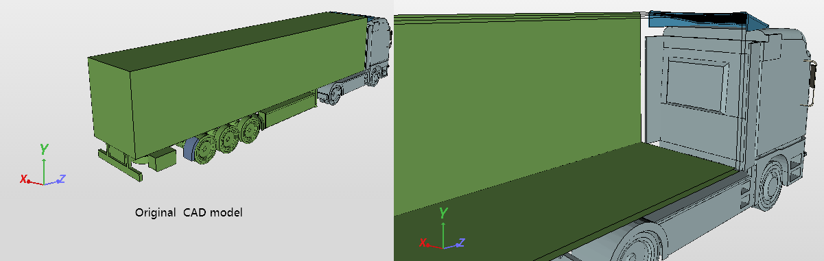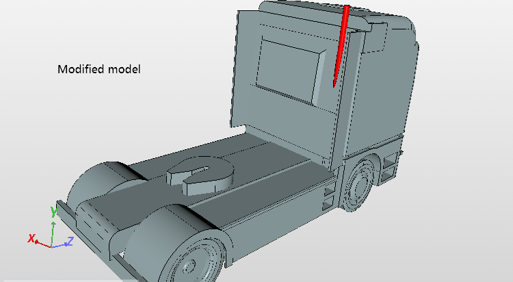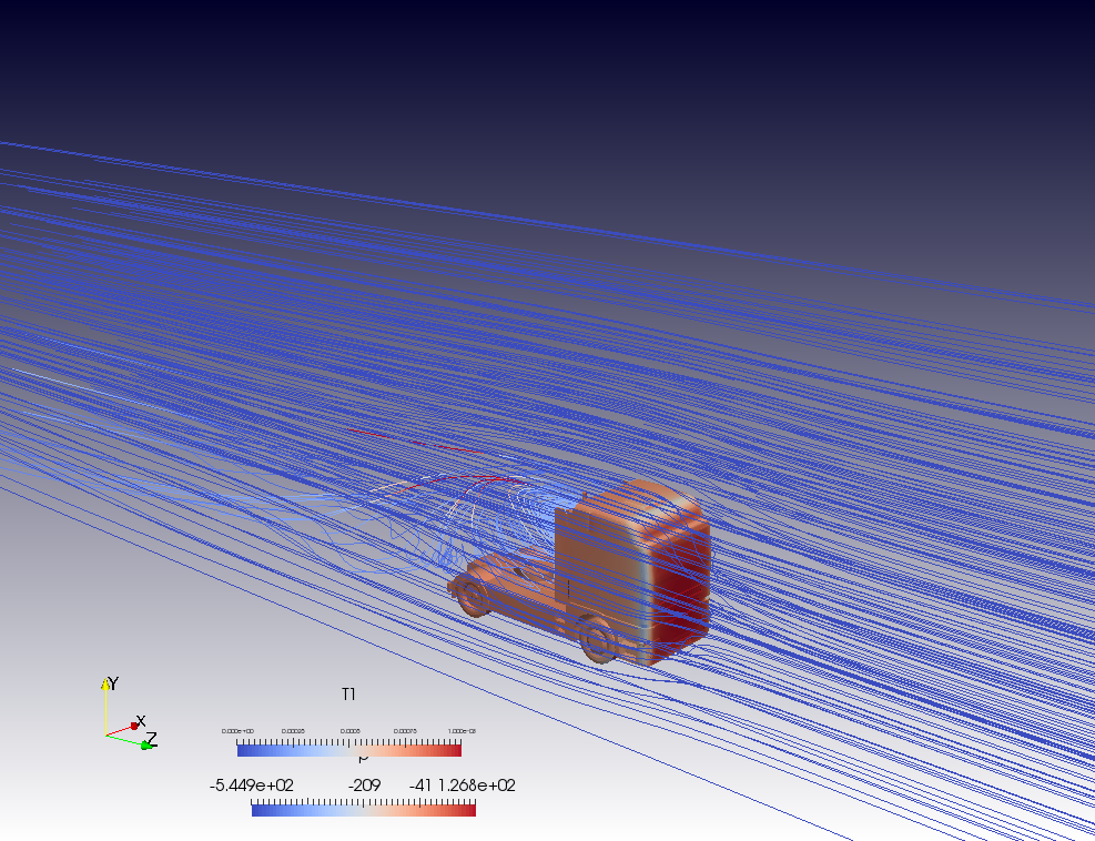 The project represents the CFD simulation of a driving truck with exhaust gases coming out its exhaust pipe (CFD + Scalar Transport modelling). The CAD model of the truck has been simplified with the program SALOME.