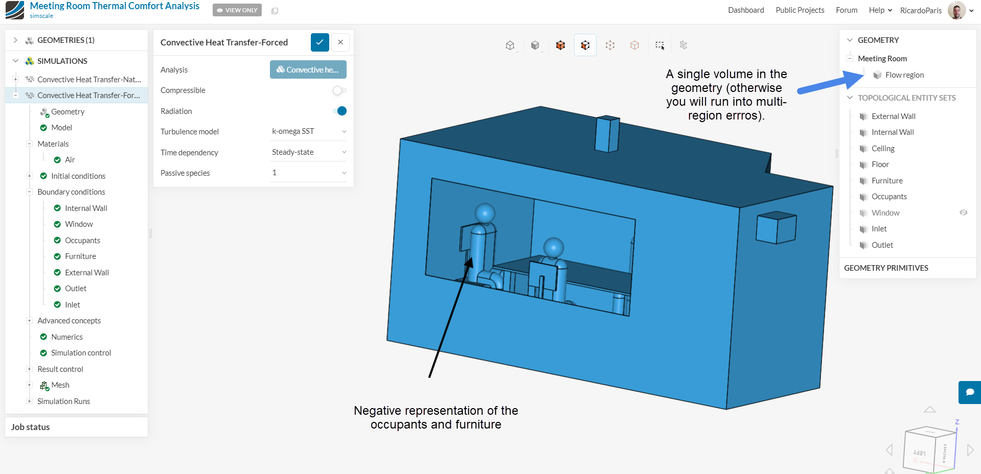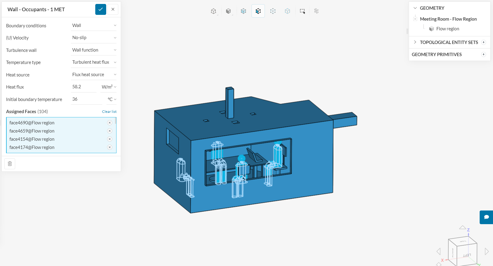 I’d recommend that you check this tutorial for the usual approach (again, this tutorial uses a single volume, which is the correct approach to model people): Thermal Comfort In a Meeting Room | Tutorial | SimScale