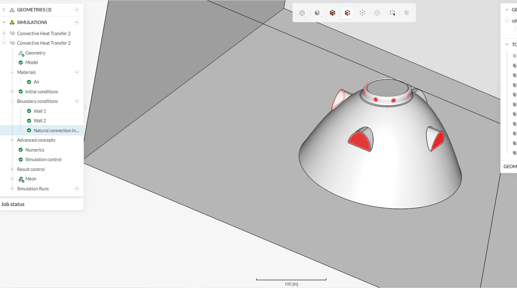 So those “natural convection inlet/outlet” BCs that you defined to those openings should not exist. If you want to model no wind around the hut, I’d recommend setting natural convection inlet/outlet to the top and sides of the enclosure instead: