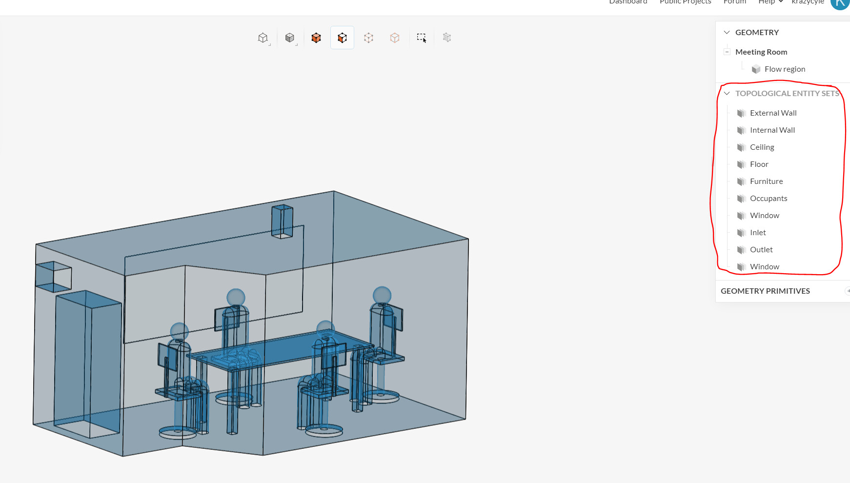 I ran the tutorial simulation and it helped a lot. What I still do not understand is that while there is only one solid (which is the flow region), but there are still other entities in the model that you can select and change their attributes. They are placed under the topological entity sets. How do i differentiate these from the flow region? If I just import the negative Boolean model I will not be able to select where the inlets, outlets, and occupants are. Do this question make sense?