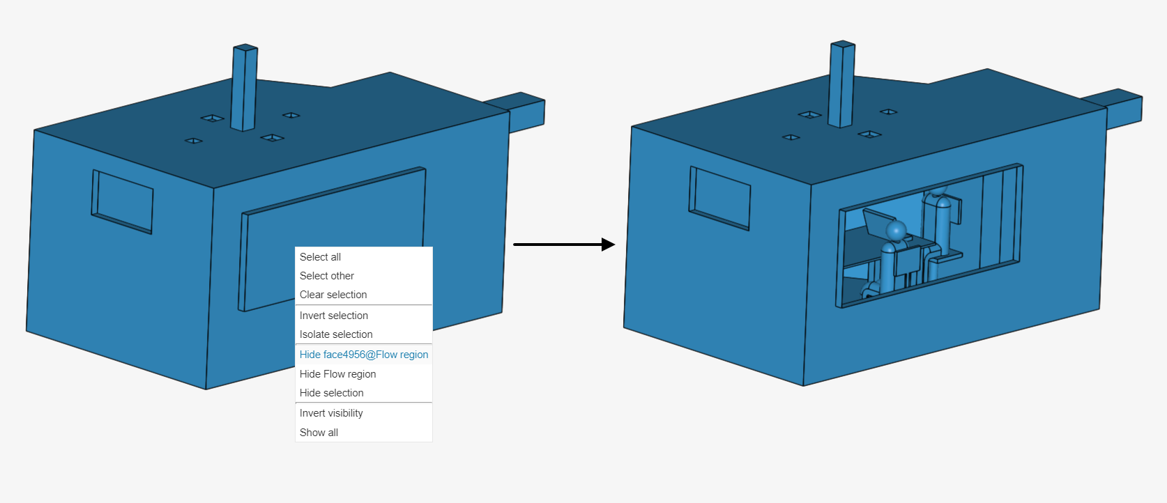 - Remove the solid parts from the flow region via boolean/subtract operations