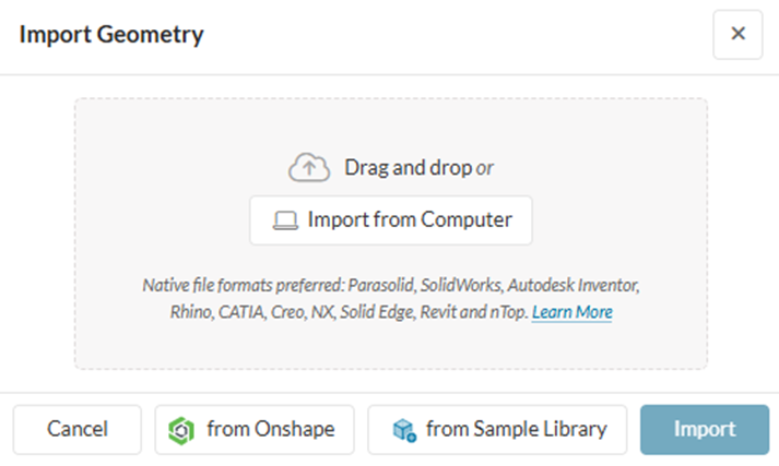Login to The SimScale, create a new project, and upload the geometry you have downloaded earlier. Whole geometry is created as a single solid volume with various surfaces.