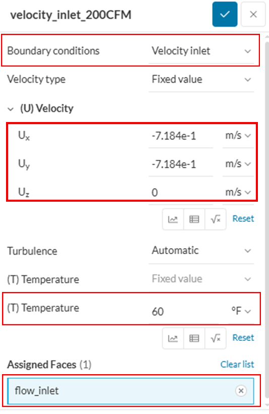 Assign the velocity inlet boundary condition to the flow_inlet face. We will use the flow velocity corresponding to the 200 Cubic Feet Per minute (CFM) flow rate at -45° angle. This corresponds to -0.71842049 m/sec in each x and y directions.