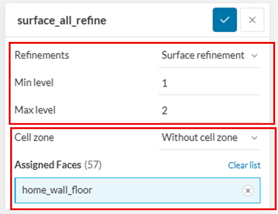 Assign surface refinements of level min 1 and max 2 to the walls and floor faces.