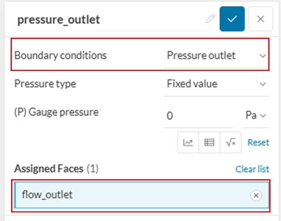 Assign the pressure outlet BC on the “flow_outlet” face.