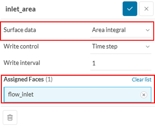 Once again, choose Surface data as “Area integral” and assign an inlet face (flow_inlet in our case).
