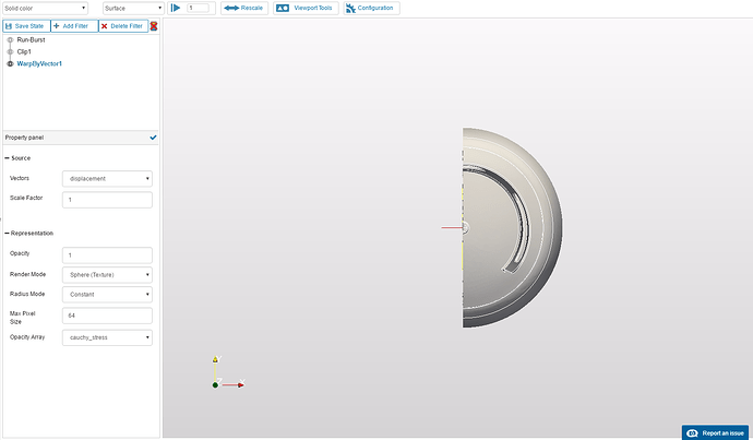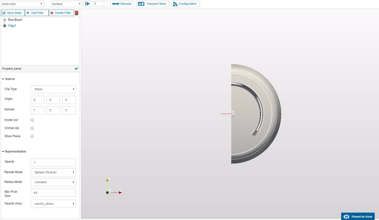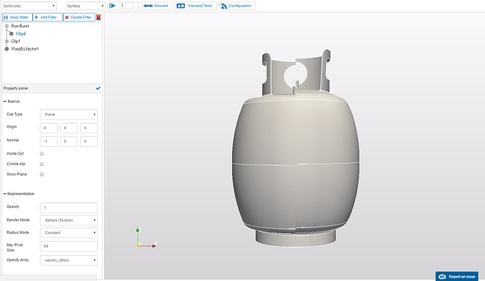 Open the Post-Processor tab and click on Solution Fields under Run-Burst in the tree at the left. This will load the paraview web viewer on the result data. Click on Add Filter and select Clip. Input the following parameters: