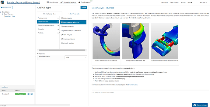 Since ours will be a non-linear structural analysis, because of the plastic material model and increasing load, select analysis type Solid Mechanics, Static analysis - advanced and Nonlinear analysis as true, then click the Save button.