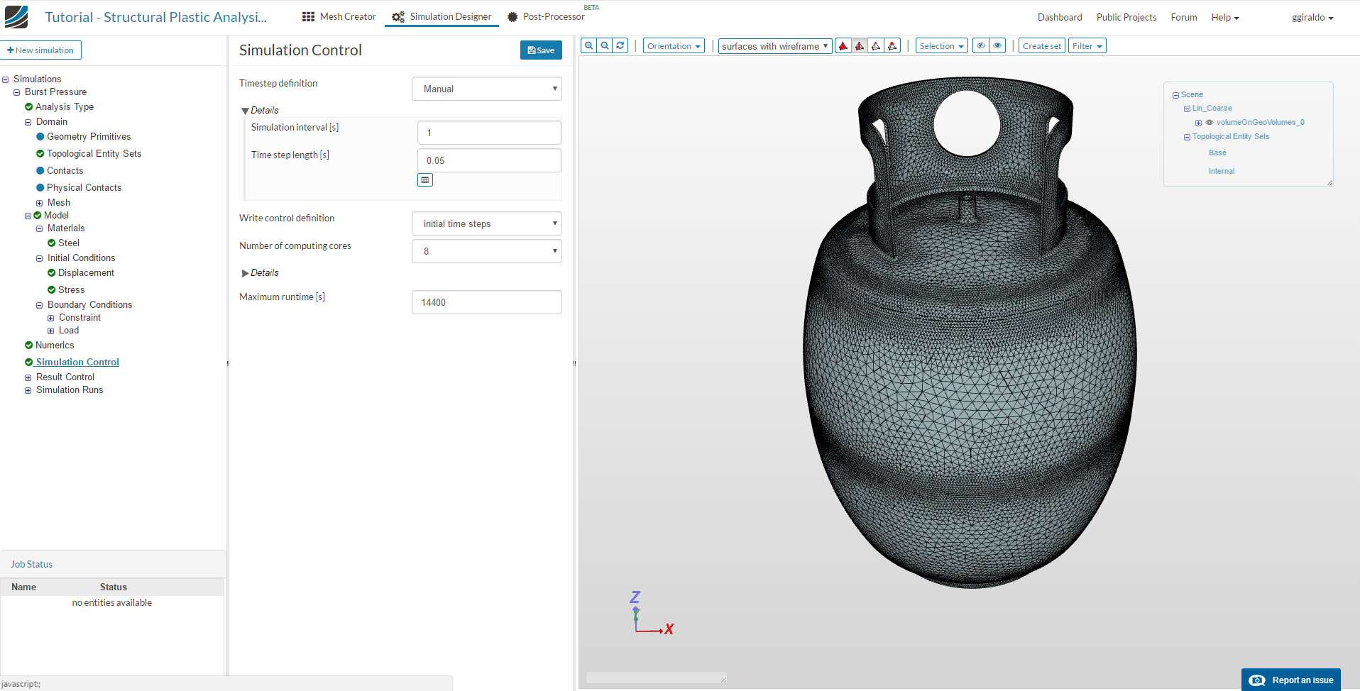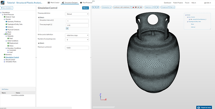 We will set the default time step to 0.05 and leave the simulation time as 1, to get 20 steps in our result. Computing cores set to 8 and maximum runtime to 14400. Save.