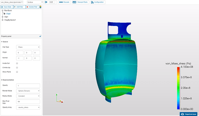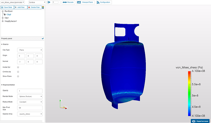 Now we will add the other half of the tank, undeformed, to compare. Select the Run-Burst data element and Add Filter. Select Clip, with following parameters: