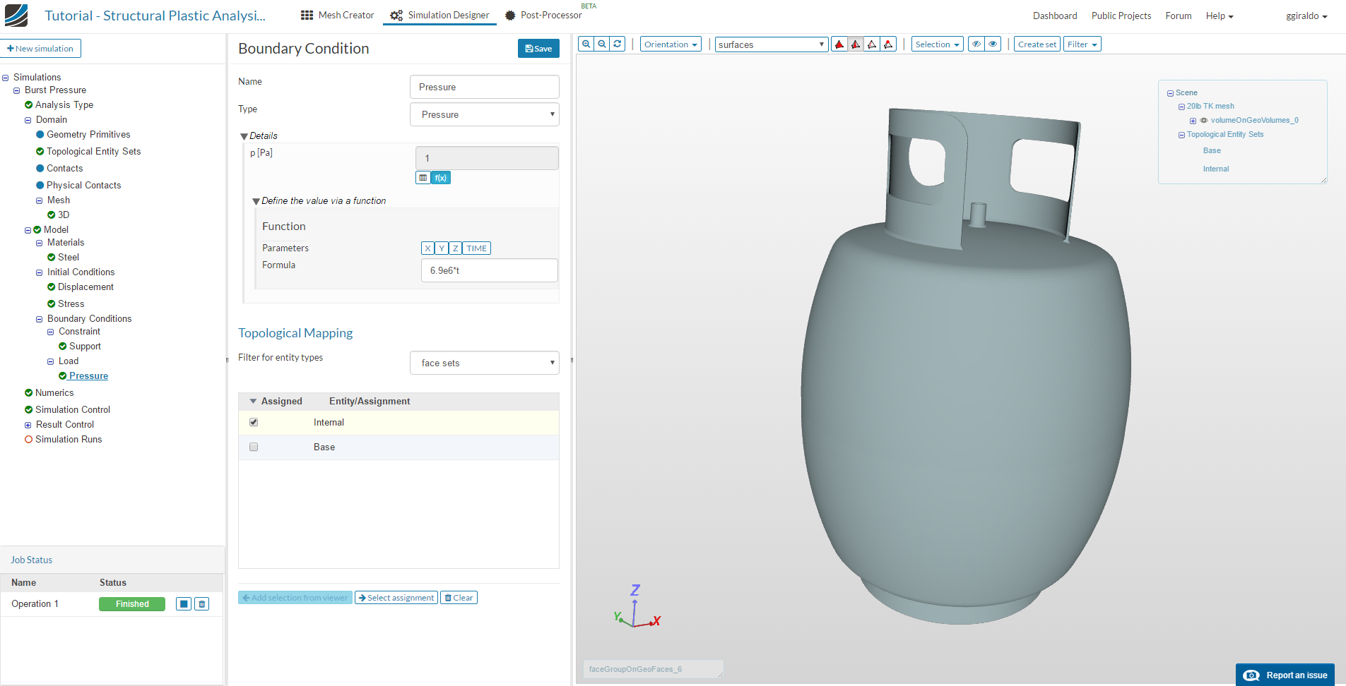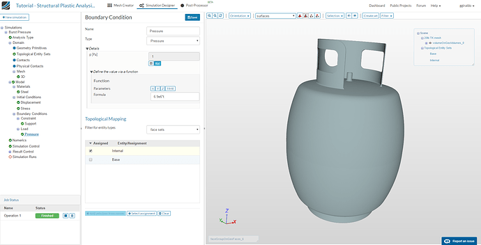 Here we will apply the increasing internal pressure. Select Load from the three and click New. Name it Pressure and leave type as pressure. In the value field, select Function, the button f(x). Enter the formula 6.9e6*t. As our simulation will run from t=0 to t=1, this will make the pressure go from 0 to the maximum value 6.9 MPa. Then select the face set we created before Internal and save.