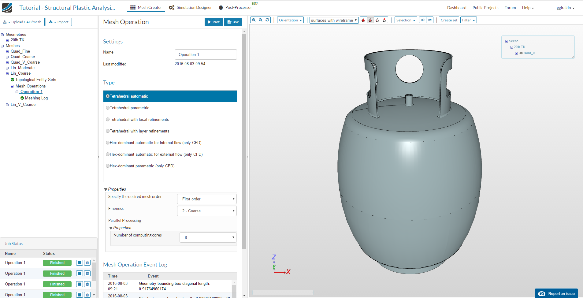 Click the Save button on the top and then Start. This will start the mesh computation on the cloud, which will take about 10 minutes to complete. Then the status will change to “Finished” and the mesh is displayed in the viewer.