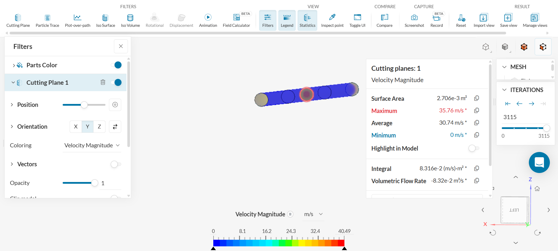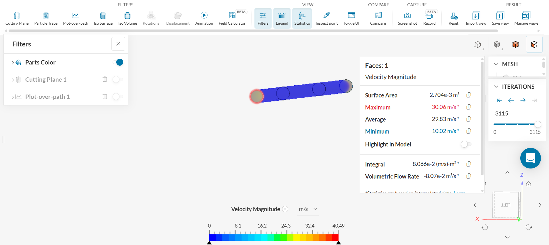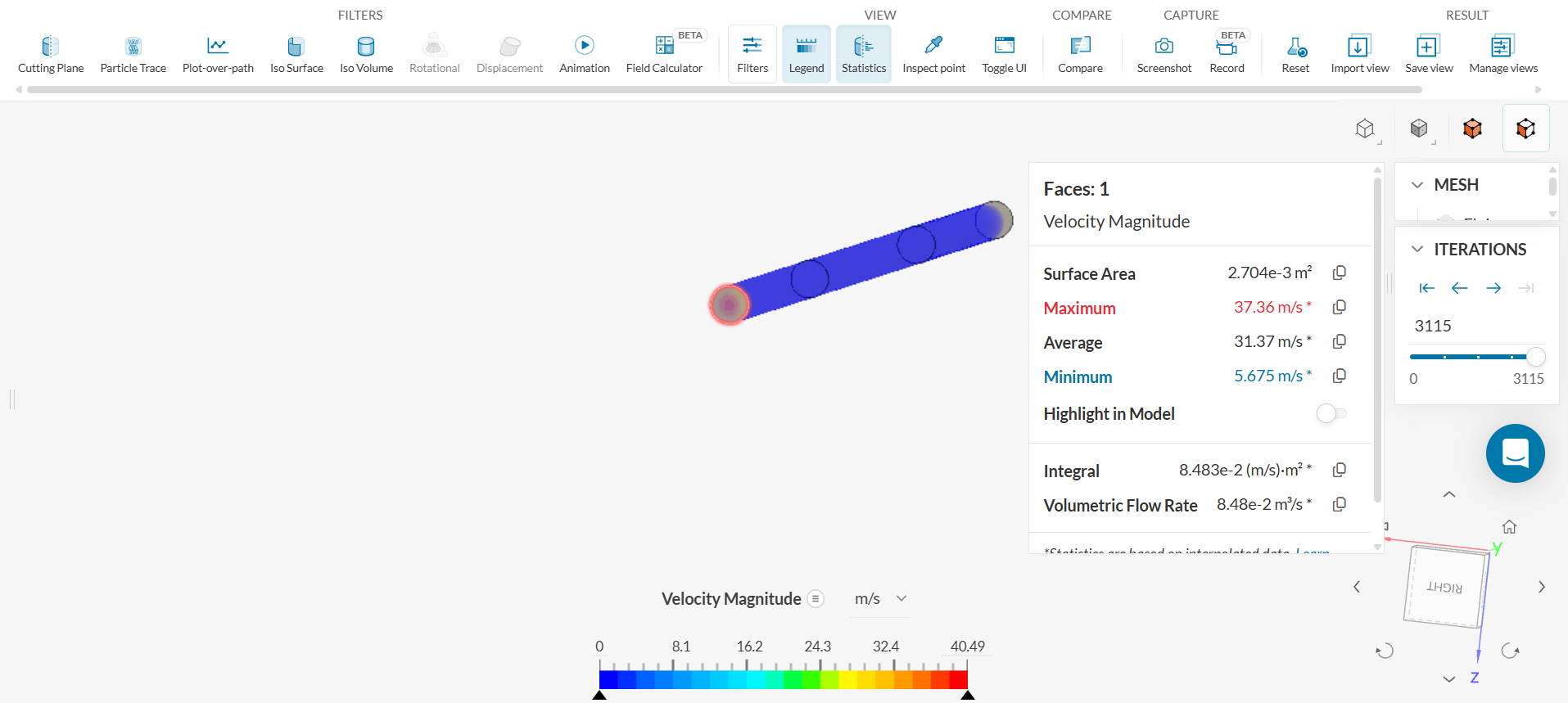 i. Click on the inlet face and then click on ‘VIEW – Statistics’ to check the volumetric flow rate.