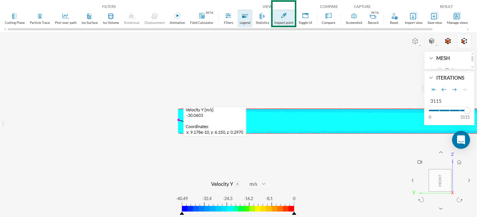 1. Check to see that the velocity at the inlet is -30.06 m/s. Click on ‘VIEW - Inspect point’ and click on the left side of the pipe (or the side of the inlet of the pipe)
