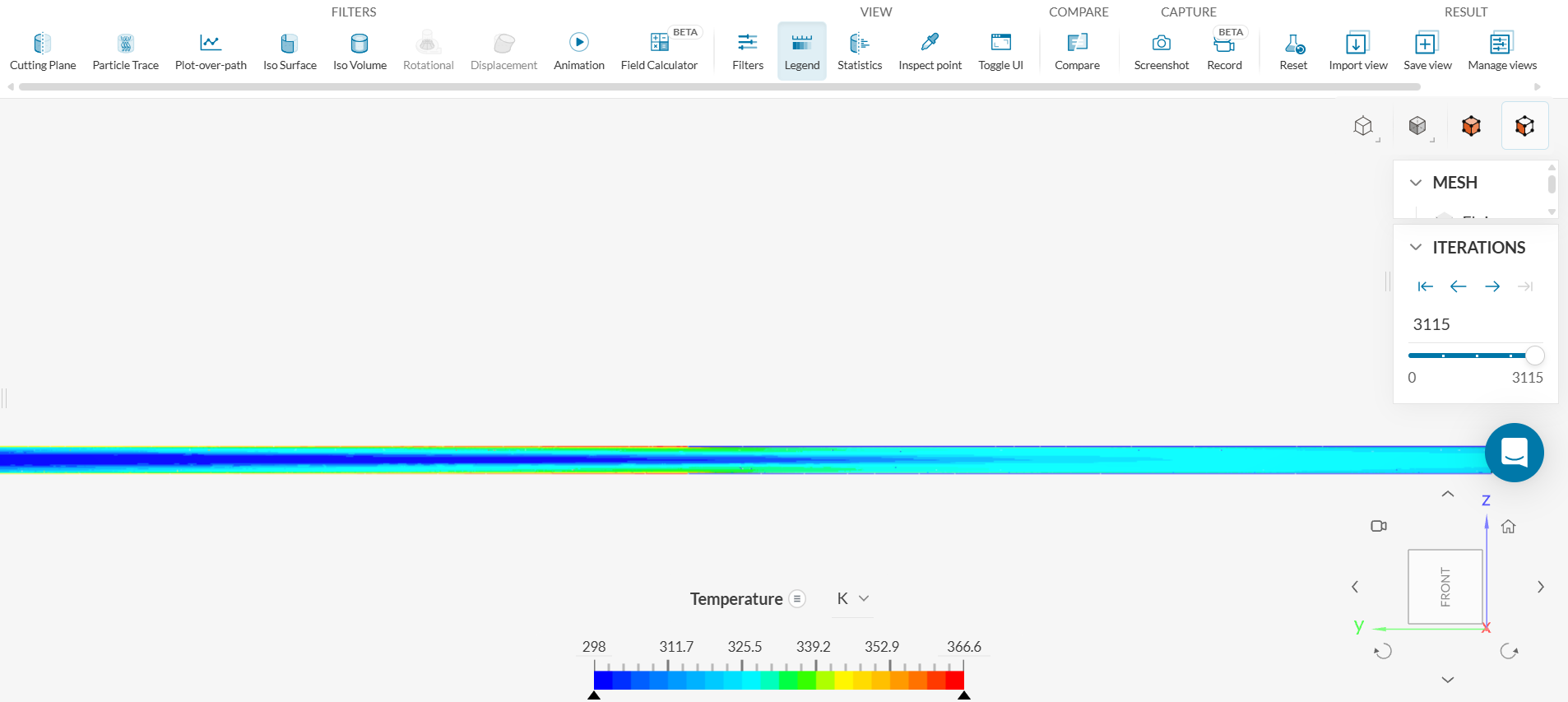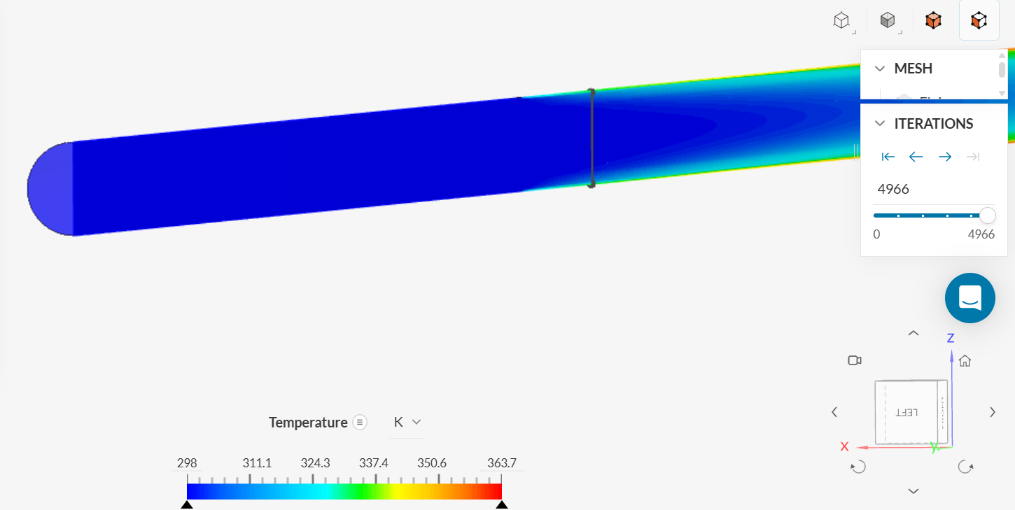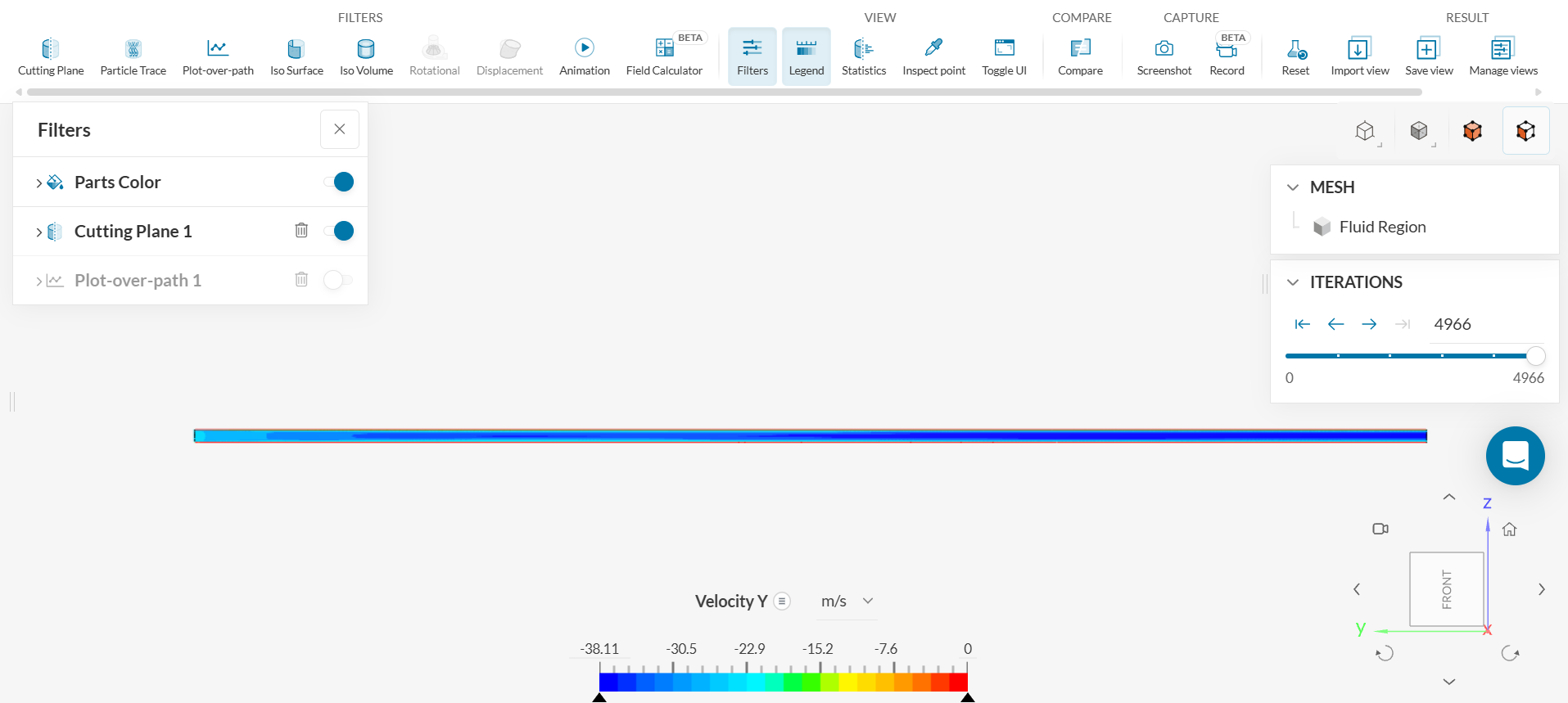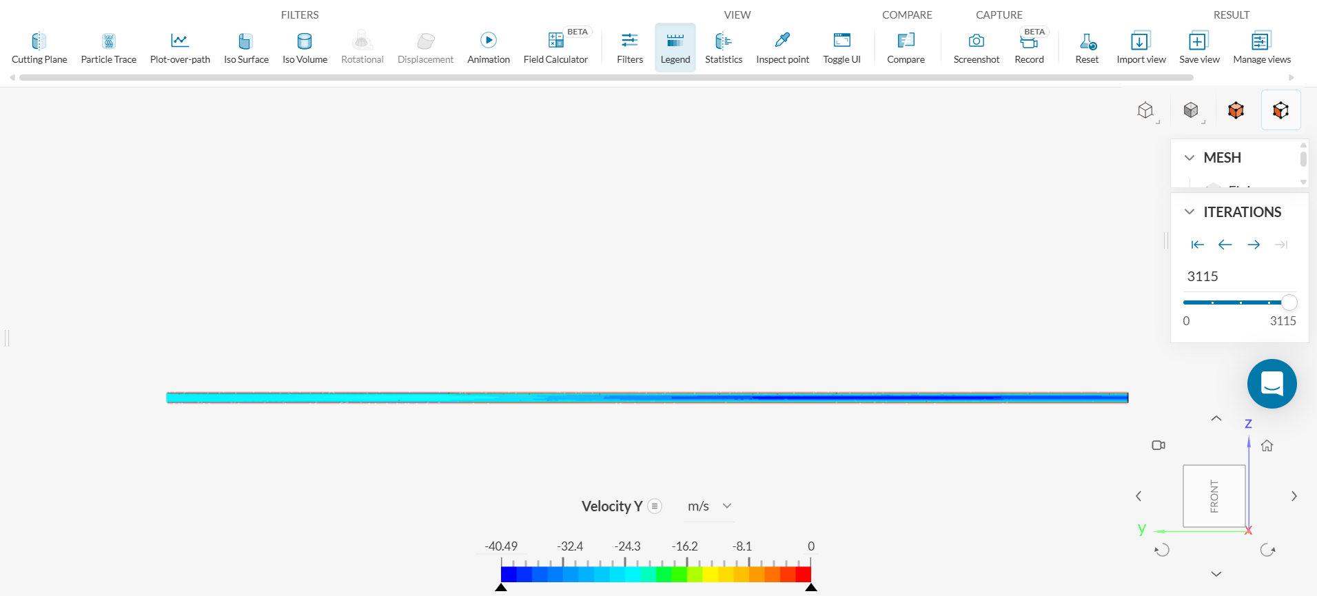 Click on the three bars next to ‘Temperature’ on the legend located on the bottom of the screen and click on ‘Velocity - Y’ to view the velocity contour. The figure below shows the y-velocity throughout the length of the pipe.