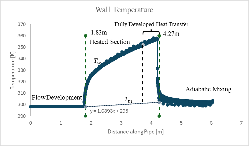 Since the mixed mean temperature is constant in the flow development region, pick a point that coincides with the temperature along Flow Development region (298.15 K) and 1.83 m (the start of the heated section). Since the mixed mean temperature is also constant along the adiabatic mixing region, pick another point that coincides with the temperature along Adiabatic Mixing region and 4.27 m (the end of the heated section). Insert a trendline and display the slope of the trendline on the graph.